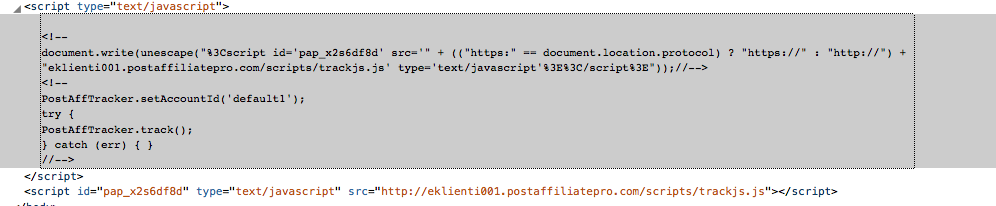 dotcompixel.com Posted April 28, 2014 Author Share Posted April 28, 2014 (edited) There is tracking code. <script type="text/javascript"><!-- document.write(unescape("%3Cscript id='pap_x2s6df8d' src='" + (("https:" == document.location.protocol) ? "https://" : "http://") + "postaffiliatepro.com/scripts/trackjs.js' type='text/javascript'%3E%3C/script%3E"));//--> </script> <script type="text/javascript"><!-- PostAffTracker.setAccountId('default1'); try { PostAffTracker.track(); } catch (err) { } //--> </script> Edited April 28, 2014 by quiced (see edit history) Link to comment Share on other sites More sharing options...