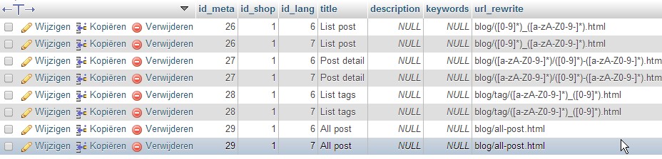 Tuinkoken Posted April 29, 2014 Author Share Posted April 29, 2014 (edited) Hey Steve, Thank you for your post, you definately got me on the right track. I went to SEO & URL in the prestashop backoffice and I found out that a link to my blog is the Friendly URL rewrite to my order-confirmation page. See my screenshot: This must have happened when I used the fix for the left column on this page http://mypresta.eu/en/art/prestashop-16/an-error-occured-while-updating-this-meta.html However I am unable to edit it from there. It gives me this error message: Property Meta->url_rewrite is not valid Can you please share your setting for this line? Edit: I also looked in my phpmyadmin and added two screenshots to this post: The first is ps_meta and the second is ps_meta_lang. Some of the records in ps_meta are not to be found in ps_meta_lang. Shouldn't both concist of the same records? Edited April 29, 2014 by Tuinkoken (see edit history) Link to comment Share on other sites More sharing options...