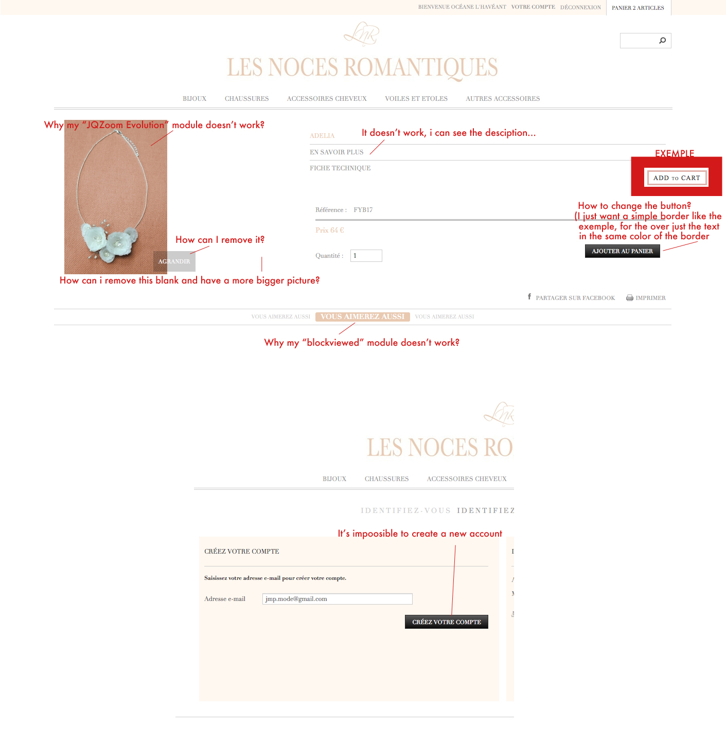 oceane Posted April 29, 2014 Share Posted April 29, 2014 Bonjour, Merci d'avance pour votre aide! Je viens de créer une e-boutique prestashop avec le template Millenium http://themeforest.net/item/millenium-prestashop-15-16-theme-blog/3865279 que j'ai personnalisé. Je rencontre plusieurs problèmes dont 2 importants! 1. Sur la fiche produit au clic comme sur la demo du template, la description n'apparaît pas! Impossible de faire apparaitre la description et autres informations... Le module "Vous aimerez aussi" ne fonctionne pas. Le module zoom ne marche plus. http://www.lesnocesr...4-raphaela.html 2. Impossible de s'inscrire pour créer un compte client (par compte avec un compte déjà créé cela marche) http://www.lesnocesr...back=my-account 3. Sur la homepage je n'arrive pas à activer le module "éditeur de homepage" car selon moi il serait parfait pour ma home (car je peux coder en html) ? (Je veux juste découper l'image de ma homapage pour revoyer vers differents liens) http://www.lesnocesromantiques.fr/ Merci. Bonne journée, Océane Link to comment Share on other sites More sharing options...