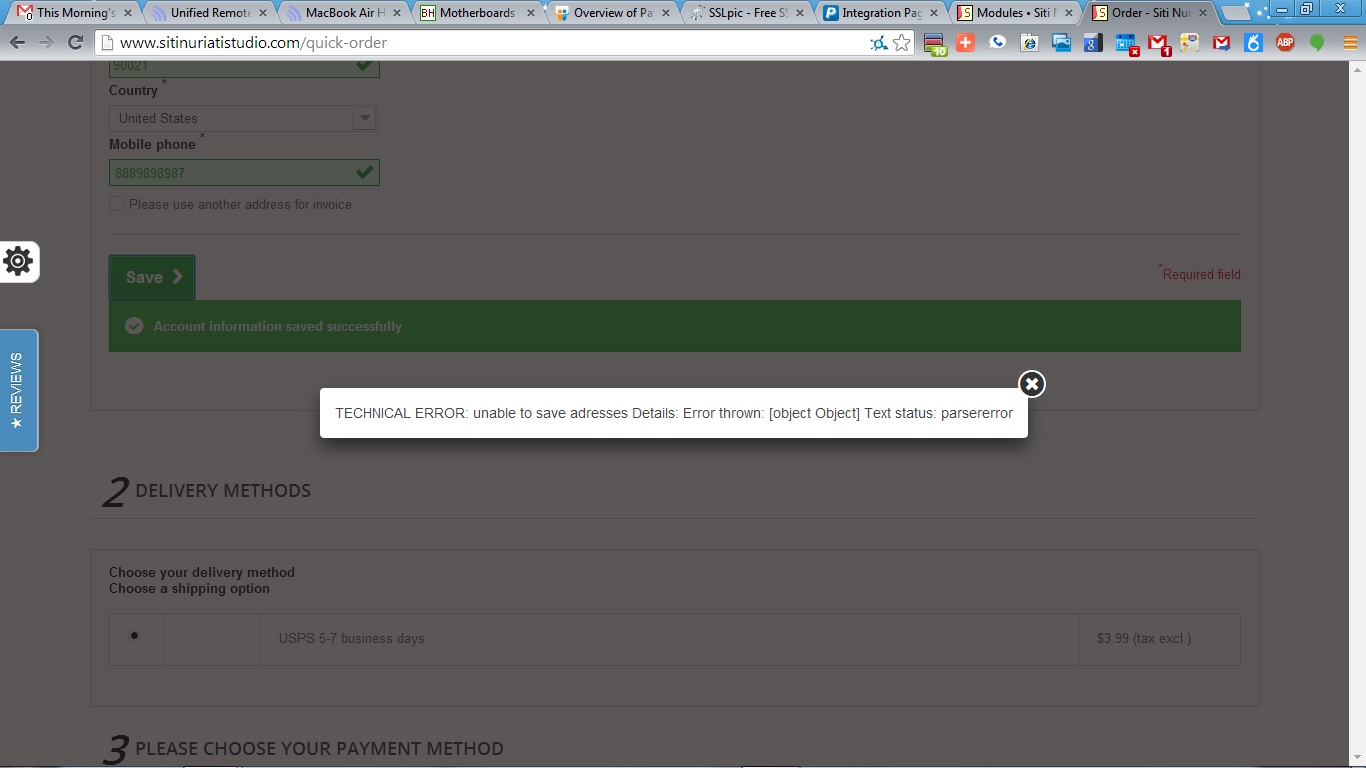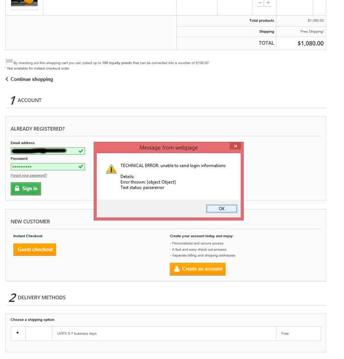 closeupman Posted May 2, 2014 Author Share Posted May 2, 2014 Hi, I got it, but it's too big to post here. Hopefully PS will allow my link here. ERROR LOG Also, if I login(using IE at least it shows the error) I get an error but it shows green check. If I use guest checkout, it give the same error I believe and no button to continue. Thanks for your help! Link to comment Share on other sites More sharing options...