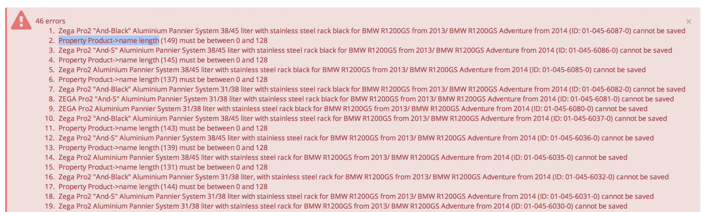 TTNZ Posted May 4, 2014 Share Posted May 4, 2014 (edited) Hi All, I am sorry as a newbie that I don't know how to do this but I get the following error when I try and import my product list. Zega Pro2 "And-Black" Aluminium Pannier System 38/45 liter with stainless steel rack black for BMW R1200GS from 2013/ BMW R1200GS Adventure from 2014 (ID: 01-045-6087-0) cannot be saved Property Product->name length (149) must be between 0 and 128 If there is anything you can suggest it would be appreciated!! :-) Nigel Edited May 4, 2014 by TTNZ (see edit history) Link to comment Share on other sites More sharing options...