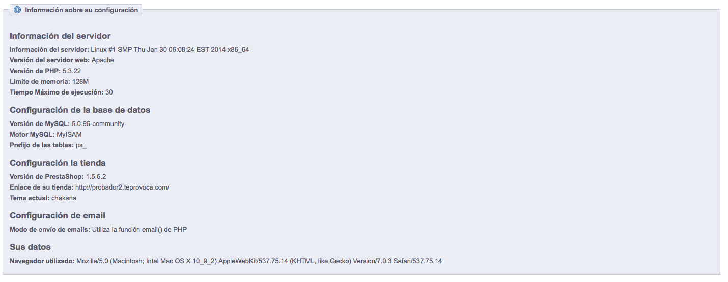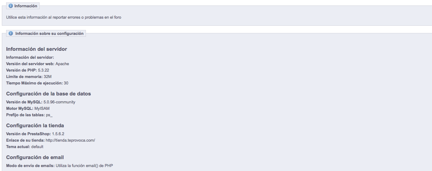 taltaroccs Posted May 5, 2014 Share Posted May 5, 2014 Buenas Noches: Saludos a todos. Mi problema es el siguiente; en la tienda que estoy armando me mostró el error de memory_limit. Como he hecho anteriormente he agregado la linea ini_set('memory_limit','128M'); en el archivo config.inic.php, pero en este caso no me resulto. Unos de los detalles que observe es que al observar la información que me da Prestashop a través de Rendimiento No muestra el nombre del servidor. Revisando en otras tiendas y en demos que he instalado, claramente sale la información del servidor(adjunto imágenes para ser mas especifico). Mi pregunta es: Sera ese el motivo por el cual en la nueva tienda no deja que aumente el limite de memoria por la edición del config.inic.php? Version Prestashop: 1.5.6 Plantilla: La que viene por defecto. Tienda: tienda.teprovoca.com P.D: La imagen que dice probador es un demo que instale y que al editar el archivo config.inc.php tomo la nueva configuración. La Imagen que dice Tienda es la que tengo que aumentar la memoria limite pero no deja. Saludos. Link to comment Share on other sites More sharing options...