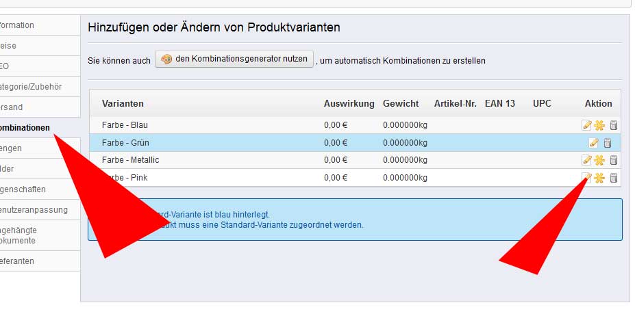 Whiley Posted May 6, 2014 Share Posted May 6, 2014 (edited) Hallo Tim, habe ich dich richtig verstanden du hast einen Artikel den es in schwarz und in rot zu unterschiedlichen Preisen gibt? D.h. du hast Variationen angelegt, dann kannst du den jeweiligen Preis im BO --> Produkte (das Produkt auswählen) --> Kombinationen (dann z.b. rote Variante auswählen) für diese eine rote Variante anpassen und dann entsprechend mit der schwarzen auch so verfahren. Grüsse Whiley Edited May 6, 2014 by Whiley (see edit history) Link to comment Share on other sites More sharing options...