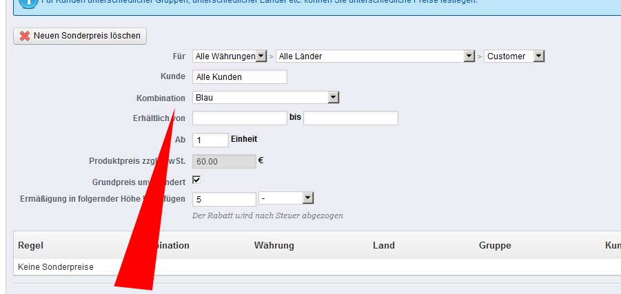 Tim1992 Posted May 6, 2014 Author Share Posted May 6, 2014 Hallo Whiley, vielen Dank für Deine Antwort. Die Situation ist diese: Ich habe einen Artikel "Boxhandschuhe xy" diese Boxhandschuhe habe ich in verschiedenen Größen und versch. Farben. Nun will ich den untersten Artikel (in diesem Falle Rot 16 UZ) nur für Händler reduzieren. Aber wie kann ich diesen einen Artikel einzeln auswählen?? Da ich ja in der Kategorie "Boxhandschuhe xy" bin, reduziert das Programm alle Größen/Farben. Oder muss ich diesen einen Handschuh dann einzeln neu anlegen? Vielen Dank Link to comment Share on other sites More sharing options...
