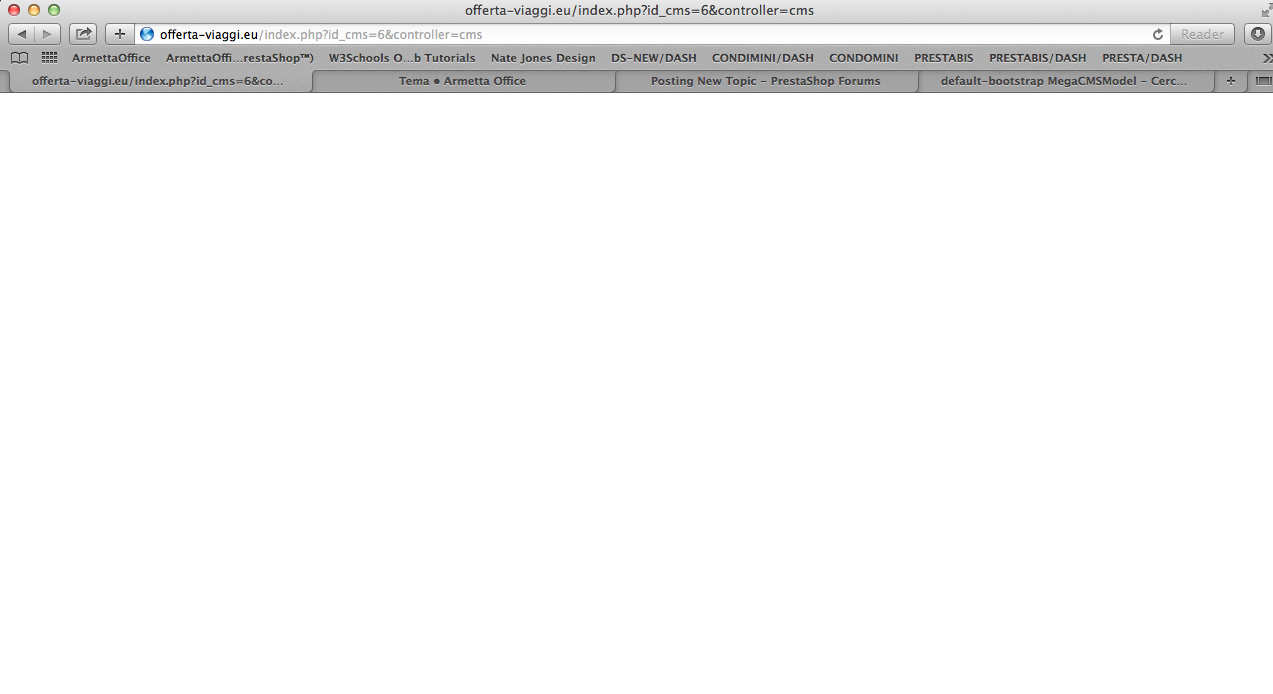 alessio.gemmi Posted May 5, 2014 Share Posted May 5, 2014 Ciao a tutti!! sono nuovo del forum, ho un problema con il tema default‐bootstrap non riesco a visualizzare i CMS creati e quelli già esistenti. Se cerco di aprire la pagina mi appare una pagina completamente bianca. Ho guardato nel file error_log e il messaggio di errore e' il seguente: [04-May-2014 17:11:01 US/Eastern] PHP Fatal error: Class 'MegaCMSModel' not found in /home/offerta/public_html/override/controllers/front/CmsController.php on line 71 ma non riesco a capire il perché. il sito è: http://offerta-viaggi.eu/ Grazie Alessio Link to comment Share on other sites More sharing options...