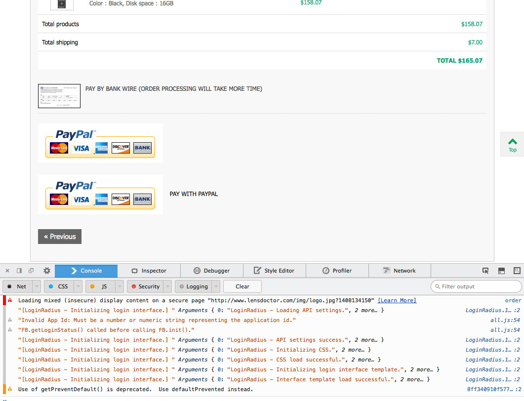 lensdoctor Posted August 16, 2014 Share Posted August 16, 2014 PayPal USA/Canada/Mexico 1.3.7 Problem I've tried it out with Prestashop 1.5.6.2 - 1.6.0.9, all clean installs. I'm making a second round of clean installs without using only the default theme. I'm at 1.6.0.6 with the PayPal USA/Canada/Mexico 1.3.7 I'm not sure, but I believe that is the same module being bundled with all the Prestashop versions I've been trying. I've been on the phone with PayPal support, 3 different times, for more than a couple hours all together. I opened Firebug web console and captured the screen for you to see. I need to say one thing, there is NO PROBLEM with the seller email and believe me, I've tried all options there. Link to comment Share on other sites More sharing options...