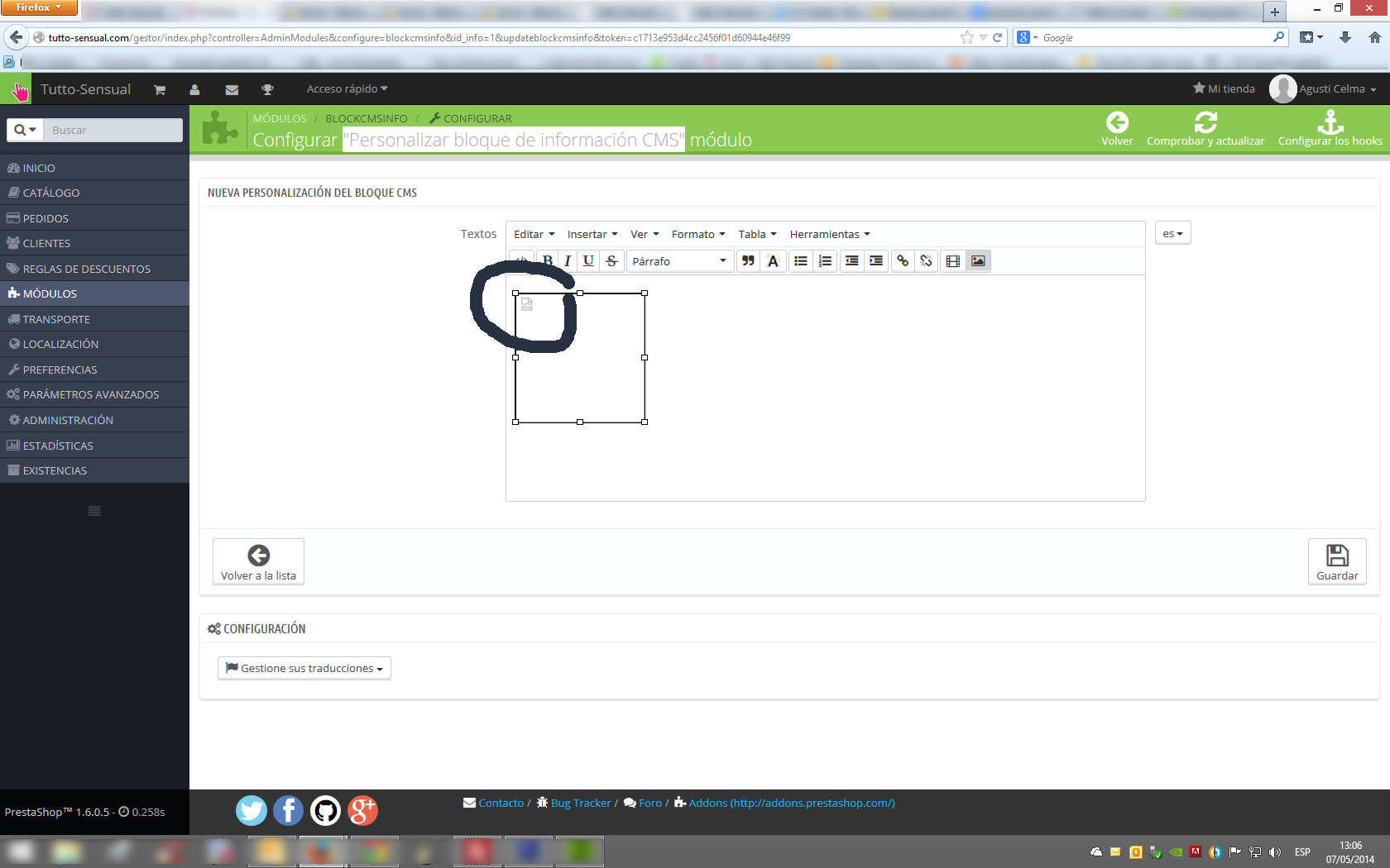 skyhand Posted May 7, 2014 Share Posted May 7, 2014 (edited) Pues eso.. intento poner una imagen a través del módulo "Personalizar bloque de información CMS" pero no me sale. Estoy con la versión 1.6.0.5. con el tema por defecto. En el cuadro del módulo, aparece como si el enlace a la foto estuviera roto. Miro por ftp y la imagen está en la carpeta img/cms/ correctamente. No lo entiendo. Alguien tiene idea de lo que puede estar pasando? La web está en http://www.tutto-sensual.com y quiero poner la imagen en el apartado CMS que queda libre en el centro, entre el módulo para Facebook y el texto "Para atrevidos" Gracias. Skyhand Edited May 7, 2014 by skyhand (see edit history) Link to comment Share on other sites More sharing options...