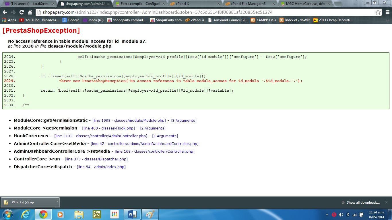 [email protected] Posted May 8, 2014 Share Posted May 8, 2014 Description When I create a new user ( with Administrator privileges) it does not allow the new user to login into the PS Backoffice. It throws out this exception:-=============[PrestaShopException] No access reference in table module_access for id_module 87.at line 2030 in file classes/module/Module.php=============... and others I've enclosed an image of the full error on the screen and it happens to all new users logging into the backoffice OTHER than the SuperAdmin. The install is a straight Prestashop 1.6.0.6 with standard features. Full Error.pdf Link to comment Share on other sites More sharing options...