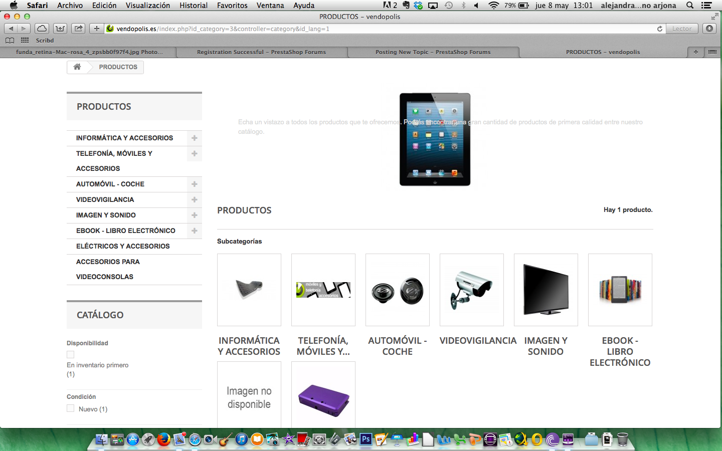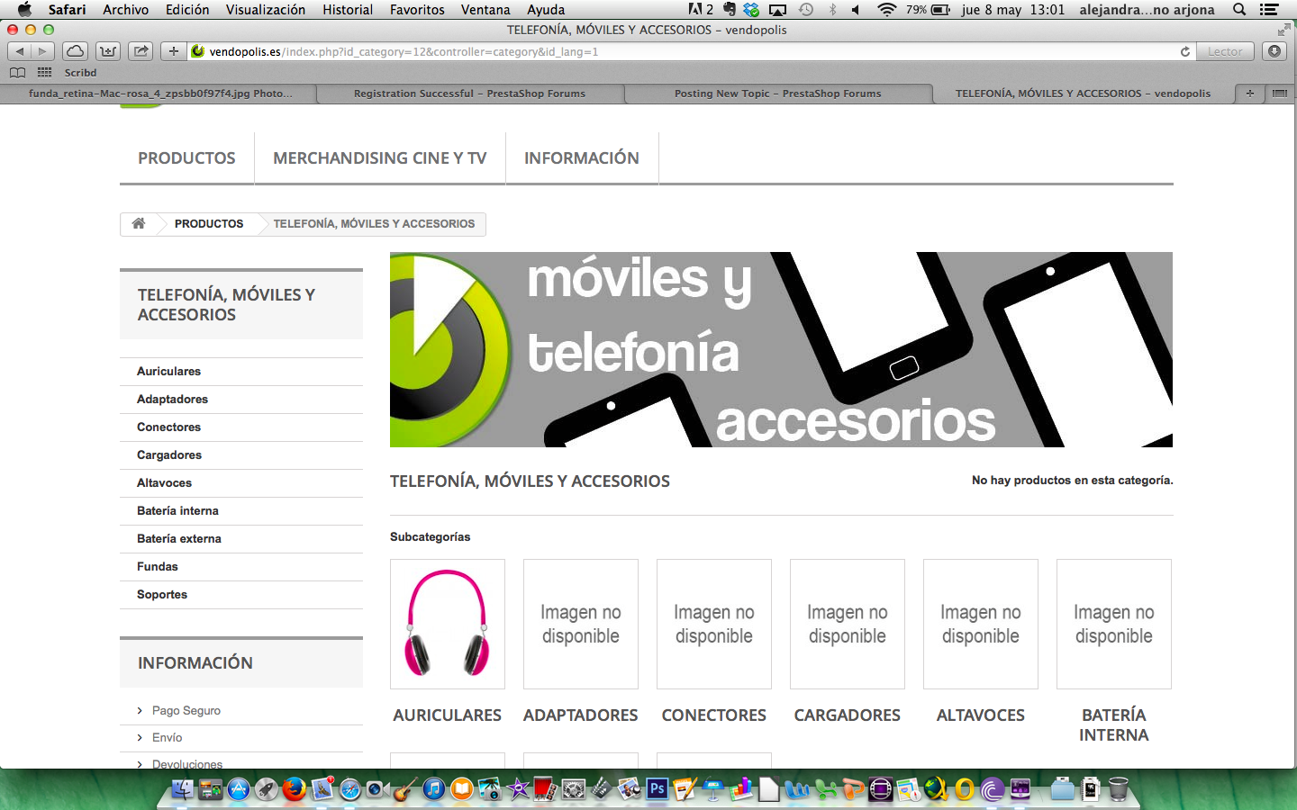alejandrix375 Posted May 8, 2014 Share Posted May 8, 2014 Hola a todos! Soy Alejandra y estoy iniciándome en prestashop. En primer lugar tengo la nueva versión de prestashop 1.6, pero tengo un pequeño problemilla con las subcategorías que se muestran. Para que puedan verlo la página que estoy editando es la siguiente: www.vendopolis.es Pues bien, les explico: 1) en el menú principal tengo: PRODUCTOS MERCHANDISING CINE Y TV INFORMACIÓN. 2) Dentro de PRODUCTOS tengo categorías como: TELEFONÍA Y MÓVILES Y ACCESORIOS, INFORMÁTICA Y ACCESORIOS... 3) Y dentro de estas categorías tengo subcategorías. Por ejemplo: Dentro de TELEFONÍA Y MÓVILES Y ACCESORIOS tengo: auriculares, cargadores, fundas... El caso es que si pincháis en la sección TELEFONÍA Y MÓVILES Y ACCESORIOS veréis que he diseñado un banner para esta sección en color gris y verde que pone el título de la sección, y automáticamente abajo aparecen las subcategorías que tengo en TELEFONÍA Y MÓVILES Y ACCESORIOS. Mi pregunta es: ¿puedo quitar que aparezcan debajo del banner las subcategorías de estas secciones?. Ya que en la parte izquierda de la pantalla ya aparece un menú desplegaba para poder acceder a las subcategorías. El problema que tengo es que el tamaño de la imagen del banner que he hecho de TELEFONÍA Y MÓVILES Y ACCESORIOS queda perfecto en tamaño cuando la web muestra esta categoría. Ahora bien, si directamente pincho en el menú la sección PRODUCTOS, me lleva a la página "productos", y debajo salen las subcategorías con su imagen pertinente (que por ahora sale imagen no disponible, porque no he metido casi nada). En este caso, dentro de PRODUCTOS, como subcategoría estaría también INFORMÁTICA, MÓVIL Y ACCESORIOS, y si lo véis la imagen del banner (que queda perfecta cuando estamos dentro de la página de TELEFONÍA Y MÓVILES Y ACCESORIOS) se queda súper pequeña cuando se muestra en "subcategorías" de la categoría PRODUCTOS. ¿Quito las subcategorías que se muestran dentro de las categorías cuando estoy en la página, por ejemplo de TELEFONÍA Y MÓVILES Y ACCESORIOS? ¿Cómo lo hago? o ¿Hay alguna manera para modificar la miniatura de la imagen que aparece en las subcategorías? (Cuando estoy dentro, por ejemplo de la categoría PRODUCTOS) Muchisimas gracias a todos! Saludos P.D Adjunto dos imágenes por si me he explicado mal. Link to comment Share on other sites More sharing options...