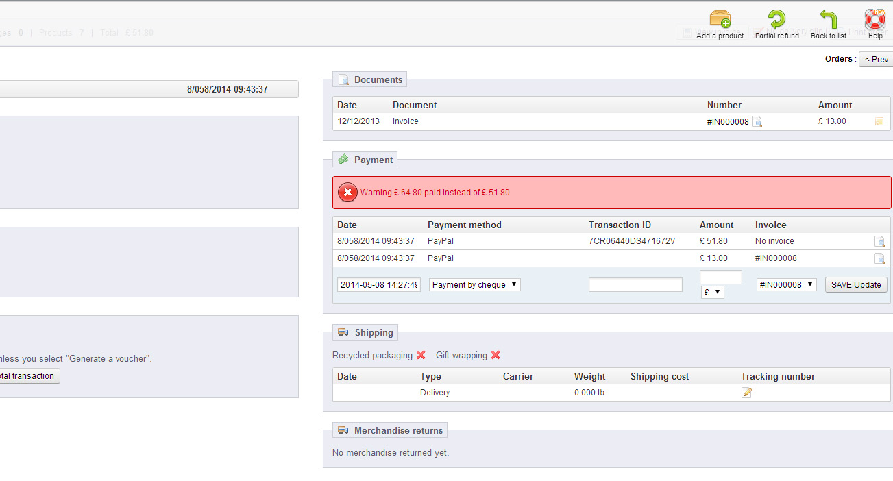beamer Posted May 8, 2014 Share Posted May 8, 2014 Hi there I have just gone live with my shop that sells virtual products. When I look at an order there is a warning message that too much has been paid. There are two payments shown, the first is the correct amount and the second is erroneous. The value of the second erroneous amount appears not to be related to the order. The invoice associated with the order only shows the erroneous amount and it says No invoice against the correct amount. When I check into the PayPal account only the correct amount is shown. It happens on most orders. The PayPal module that is installed is 3.6.1 Any suggestions as to what is going wrong? PaymentWarning £ 64.80 paid instead of £ 51.80 Date Payment method Transaction ID Amount Invoice 8/058/2014 09:43:37 PayPal 7CR06440DS471672V £ 51.80 No invoice 8/058/2014 09:43:37 PayPal £ 13.00 #IN000008 Payment by cheque PayPal £ #IN000008 Link to comment Share on other sites More sharing options...