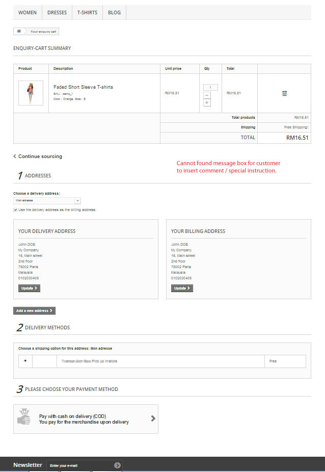 seanloo Posted May 9, 2014 Author Share Posted May 9, 2014 (edited) https://www.flickr.com/photos/121354636@N08/13959115969/ For one-page checkout, add these code into "order-opc.tpl" Now, customer or guest can write comment or special instruction about the order, no matter "standard five steps" or "one-page checkout". <div id="ordermsg" class="form-group"> <label>{l s='If you would like to add a comment about your order, please write it in the field below.'}</label> <textarea class="form-control" cols="60" rows="6" name="message">{if isset($oldMessage)}{$oldMessage}{/if}</textarea> </div> Edited May 10, 2014 by seanloo (see edit history) Link to comment Share on other sites More sharing options...