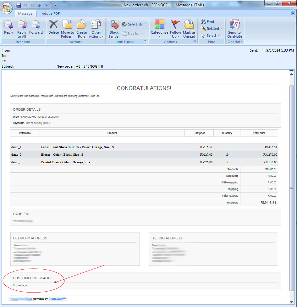 seanloo Posted May 9, 2014 Share Posted May 9, 2014 PS 1.6.0.6 with "Mail Alerts" enable. Merchant will receive a notification when an order is placed. In the email, there is a section for "Customer Message" But on checkout page (one-page checkout), customer and guest cannot find any message box/form. How to insert customer message (for special instruction for his order)? I dont know if it is a bug... Or am i miss/delete something there after edit the theme files? Remark: It seems like standard five-step checkout has no problem. Customer can insert comment under addresses. Link to comment Share on other sites More sharing options...
