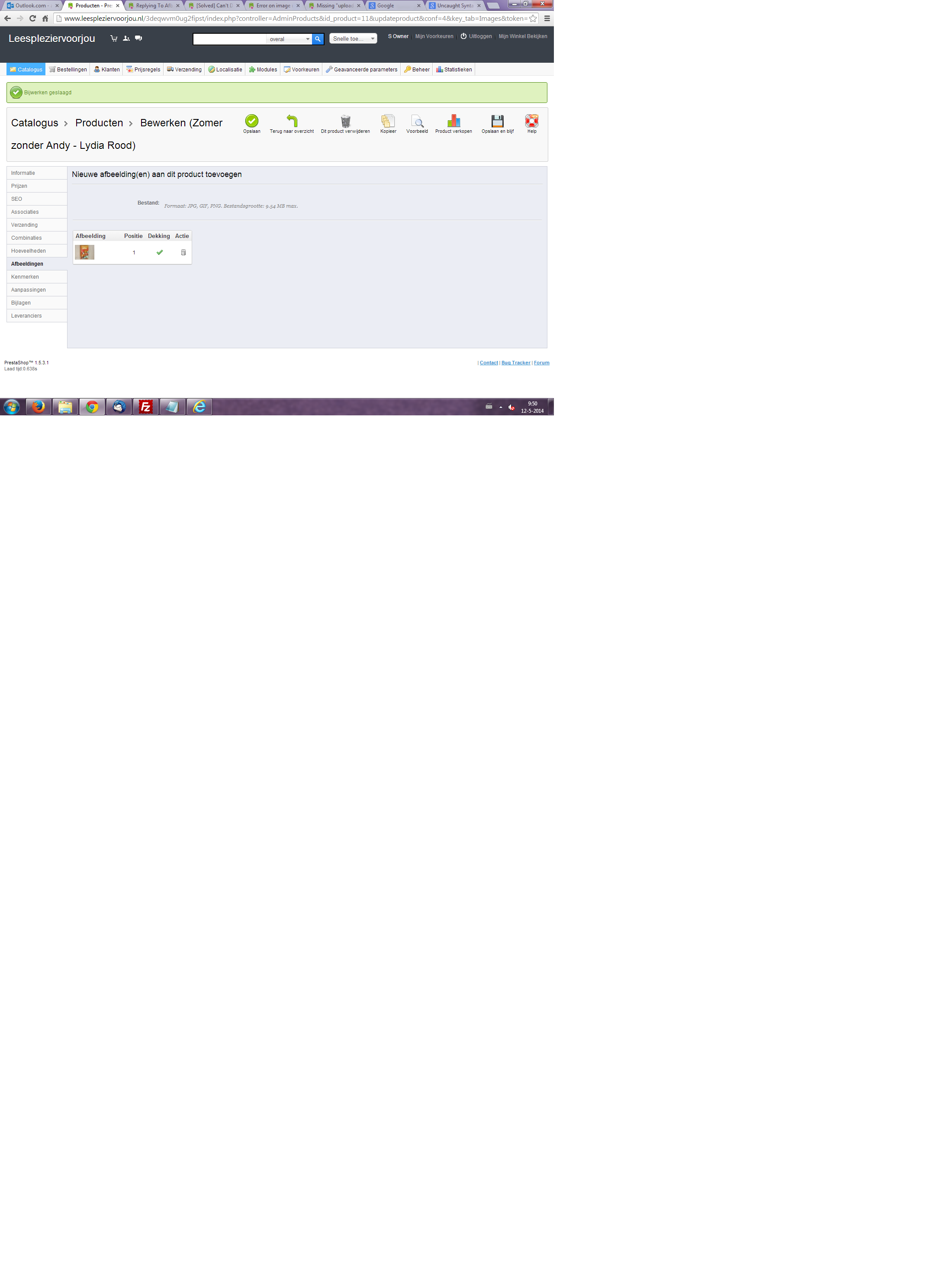 annegirly Posted May 12, 2014 Author Share Posted May 12, 2014 Als ik bij het product op opslaan en blijf klik, krijg ik het volgende. zie de afbeelding Bij foutmeldingen zie ik: Uncaught SyntaxError: Unexpected token : fileuploader.js:1091 Uncaught ReferenceError: qq is not defined index.php?controller=AdminProducts&id_product=11&updateproduct&conf=4&key_tab=Images&token=a315b5f9…:48 event.returnValue is deprecated. Please use the standard event.preventDefault() instead. Attr.specified is deprecated. Its value is always true. Iemand tips hoe ik het kan verhelpen? Groetjes Anne Link to comment Share on other sites More sharing options...