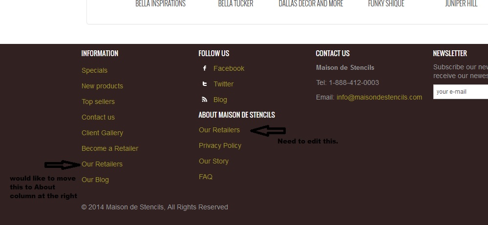 highseas Posted May 13, 2014 Share Posted May 13, 2014 Hello, I have taken over a site and now trying to figure out how I can edit some links in the multi shop footer. I added a link to the Information column but want to edit/remove a link in the "About Maison de Stencils" column. See image. Thanks for any help! Link to comment Share on other sites More sharing options...