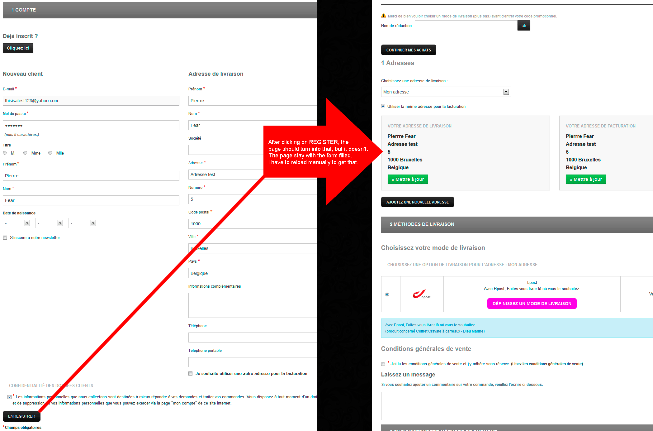 dragoeco Posted May 13, 2014 Share Posted May 13, 2014 (edited) hi, I have a problem with my new shop. When I add some item in the cart, I am redirected into it and there I have to create a new account, but when I click on register button, the page stays the same. I mean, normaly when I create a new account from this page, the page should reload automatically to show the bill/delivery address option, but it doesn't (But I get the registration confirmation email). I have to click on login button or refresh manually and then I can choose the address. I searched for an answer with this forum and google but until now I found no help Anyone can help please? Thank's. Prestashop 1.5.5 Link: http://coffret-cravate.com/shop/en/6-notre-collection (in test mode) Edited May 26, 2014 by dragoeco (see edit history) Link to comment Share on other sites More sharing options...