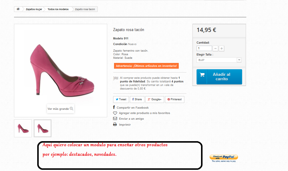 Caminandobien Posted May 14, 2014 Share Posted May 14, 2014 (edited) Buenas compañeros, No sé muy bien como se llama lo que quiero, os intentaré explica para que me ayudeis. Cuando el cliente clica sobre un producto, dentro de la ficha de descripción del mismo, apareciera otros productos más abajo o al lado (por ejemplo, otros productos recomendados, productos populares). Os he adjuntado un archivo para que podéis ver lo que quiero. ¿Alguién me echa una mano? Gracias. Edited May 14, 2014 by Caminandobien (see edit history) Link to comment Share on other sites More sharing options...