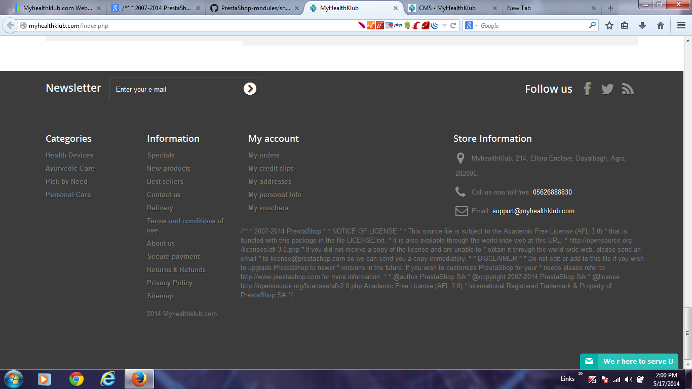 [email protected] Posted May 17, 2014 Share Posted May 17, 2014 Hi, suddenly in my shop's footer I am getting this test displayed /** * 2007-2014 PrestaShop * * NOTICE OF LICENSE * * This source file is subject to the Academic Free License (AFL 3.0) * that is bundled with this package in the file LICENSE.txt. * It is also available through the world-wide-web at this URL: * http://opensource.org/licenses/afl-3.0.php * If you did not receive a copy of the license and are unable to * obtain it through the world-wide-web, please send an email * to [email protected] so we can send you a copy immediately. * * DISCLAIMER * * Do not edit or add to this file if you wish to upgrade PrestaShop to newer * versions in the future. If you wish to customize PrestaShop for your * needs please refer to http://www.prestashop.com for more information. * * @author PrestaShop SA * @copyright 2007-2014 PrestaShop SA * @license http://opensource.org/licenses/afl-3.0.php Academic Free License (AFL 3.0) * International Registered Trademark & Property of PrestaShop SA */ How to remove this please guide me. Any one can visit the site and see it in footer. my website is www.myhealthklub.com Link to comment Share on other sites More sharing options...