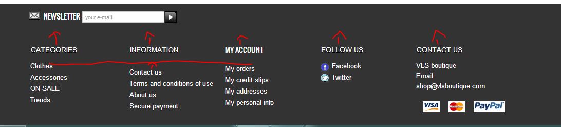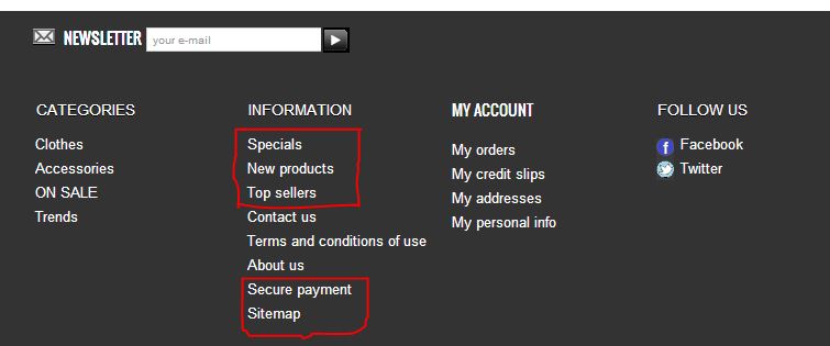 dioniz Posted May 18, 2014 Share Posted May 18, 2014 Open yourtheme/modules/blockcms/blockcms.tpl and remove those links or try to put this code in: {* * 2007-2014 PrestaShop * * NOTICE OF LICENSE * * This source file is subject to the Academic Free License (AFL 3.0) * that is bundled with this package in the file LICENSE.txt. * It is also available through the world-wide-web at this URL: * http://opensource.org/licenses/afl-3.0.php * If you did not receive a copy of the license and are unable to * obtain it through the world-wide-web, please send an email * to [email protected] so we can send you a copy immediately. * * DISCLAIMER * * Do not edit or add to this file if you wish to upgrade PrestaShop to newer * versions in the future. If you wish to customize PrestaShop for your * needs please refer to http://www.prestashop.com for more information. * * @author PrestaShop SA <[email protected]> * @copyright 2007-2014 PrestaShop SA * @license http://opensource.org/licenses/afl-3.0.php Academic Free License (AFL 3.0) * International Registered Trademark & Property of PrestaShop SA *} {if $block == 1} <!-- Block CMS module --> {foreach from=$cms_titles key=cms_key item=cms_title} <section id="informations_block_left_{$cms_key}" class="block informations_block_left"> <p class="title_block"> <a href="{$cms_title.category_link|escape:'html':'UTF-8'}"> {if !empty($cms_title.name)}{$cms_title.name}{else}{$cms_title.category_name}{/if} </a> </p> <div class="block_content list-block"> <ul> {foreach from=$cms_title.categories item=cms_page} {if isset($cms_page.link)} <li class="bullet"> <a href="{$cms_page.link|escape:'html':'UTF-8'}" title="{$cms_page.name|escape:'html':'UTF-8'}"> {$cms_page.name|escape:'html':'UTF-8'} </a> </li> {/if} {/foreach} {foreach from=$cms_title.cms item=cms_page} {if isset($cms_page.link)} <li> <a href="{$cms_page.link|escape:'html':'UTF-8'}" title="{$cms_page.meta_title|escape:'html':'UTF-8'}"> {$cms_page.meta_title|escape:'html':'UTF-8'} </a> </li> {/if} {/foreach} {if $cms_title.display_store} <li> <a href="{$link->getPageLink('stores')|escape:'html':'UTF-8'}" title="{l s='Our stores' mod='blockcms'}"> {l s='Our stores' mod='blockcms'} </a> </li> {/if} </ul> </div> </section> {/foreach} <!-- /Block CMS module --> {else} <!-- MODULE Block footer --> <section class="footer-block col-xs-12 col-sm-2" id="block_various_links_footer"> <h4>{l s='Information' mod='blockcms'}</h4> <ul class="toggle-footer"> {if $show_price_drop && !$PS_CATALOG_MODE} <li class="item"> <a href="{$link->getPageLink('prices-drop')|escape:'html':'UTF-8'}" title="{l s='Specials' mod='blockcms'}"> {l s='Specials' mod='blockcms'} </a> </li> {/if} {if $show_new_products} <li class="item"> <a href="{$link->getPageLink('new-products')|escape:'html':'UTF-8'}" title="{l s='New products' mod='blockcms'}"> {l s='New products' mod='blockcms'} </a> </li> {/if} {if $show_best_sales && !$PS_CATALOG_MODE} <li class="item"> <a href="{$link->getPageLink('best-sales')|escape:'html':'UTF-8'}" title="{l s='Top sellers' mod='blockcms'}"> {l s='Top sellers' mod='blockcms'} </a> </li> {/if} {if $display_stores_footer} <li class="item"> <a href="{$link->getPageLink('stores')|escape:'html':'UTF-8'}" title="{l s='Our stores' mod='blockcms'}"> {l s='Our stores' mod='blockcms'} </a> </li> {/if} {if $show_contact} <li class="item"> <a href="{$link->getPageLink($contact_url, true)|escape:'html':'UTF-8'}" title="{l s='Contact us' mod='blockcms'}"> {l s='Contact us' mod='blockcms'} </a> </li> {/if} {foreach from=$cmslinks item=cmslink} {if $cmslink.meta_title != ''} <li class="item"> <a href="{$cmslink.link|addslashes|escape:'html':'UTF-8'}" title="{$cmslink.meta_title|escape:'html':'UTF-8'}"> {$cmslink.meta_title|escape:'html':'UTF-8'} </a> </li> {/if} {/foreach} {if $show_sitemap} <li> <a href="{$link->getPageLink('sitemap')|escape:'html':'UTF-8'}" title="{l s='Sitemap' mod='blockcms'}"> {l s='Sitemap' mod='blockcms'} </a> </li> {/if} </ul> {$footer_text} </section> {if $display_poweredby} <section class="bottom-footer col-xs-12"> <div> © 2014 {l s='[1]Ecommerce software by %s[/1]' mod='blockcms' sprintf=['PrestaShop™'] tags=['<a class="_blank" href="http://www.prestashop.com">']} </div> </section> {/if} <!-- /MODULE Block footer --> {/if} 1 Link to comment Share on other sites More sharing options...
