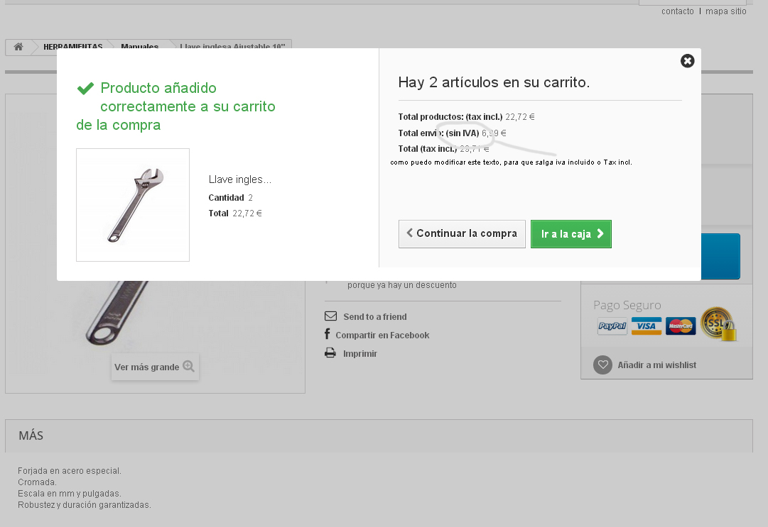 saneamador Posted May 21, 2014 Author Share Posted May 21, 2014 hola, otra vez necesito vuestra ayuda, como puedo o donde debo de mirar para modificar el texto del carrito de compra ya que me sale " sin iva", cuando de verdad el calcula esta con el iva incluido. adjunto un pic por si no me explico bien, explicarme facilito que si no me pierdo. Gracias y un saludo. www.saneamador.es version 1.6 Link to comment Share on other sites More sharing options...