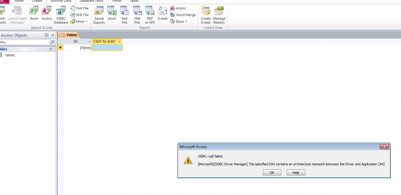 Bill Dalton Posted May 21, 2014 Share Posted May 21, 2014 (edited) Are you using a 64 bit Access application and a 32 bit ODBC driver? Added: Or the other way around ... Edited May 21, 2014 by Bill Dalton (see edit history) 1 Link to comment Share on other sites More sharing options...
