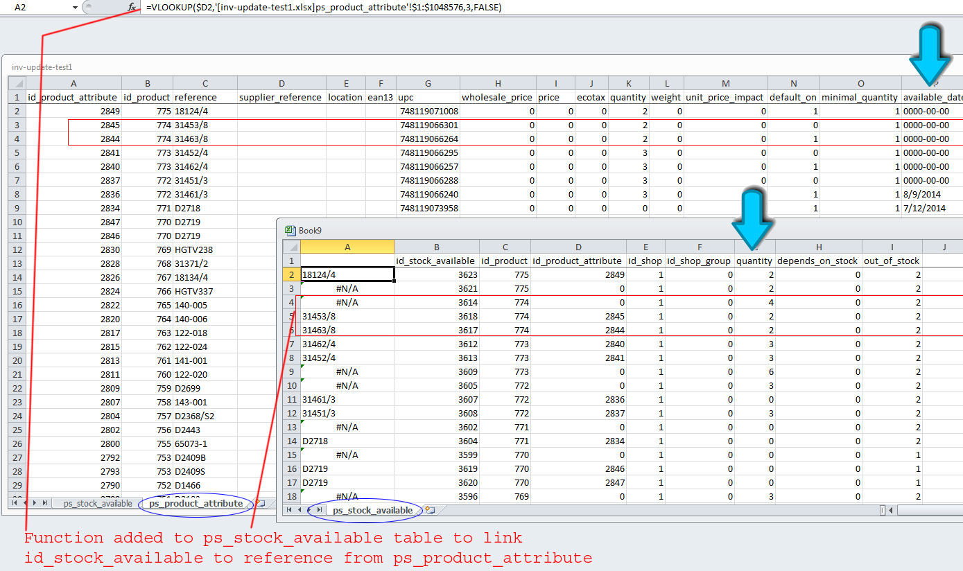 Whispar1 Posted May 21, 2014 Author Share Posted May 21, 2014 Yeah I appreciate the heads up. Will be careful for sure. And no, it's not a lot, especially when you have clients like you do - I would think they would appreciate the extra measure you take to make sure nothing blows up - especially on a live shop This all stems from the inventory update thread you commented on yesterday. With many of the tables, I like working with them directly through phpmyadmin. It's a lot quicker for some things than going through every item one by one in the BO. For now, the only files I need to update are ps_stock_available but the only way I can update that is if I somehow tie in ps_product_attribute because it's the only table I have found that has both the reference AND product id. The attached image is a little messy but gives an idea on what I am thinking... the blue arrows are the two columns that I need to update regularly. Make sense? Link to comment Share on other sites More sharing options...