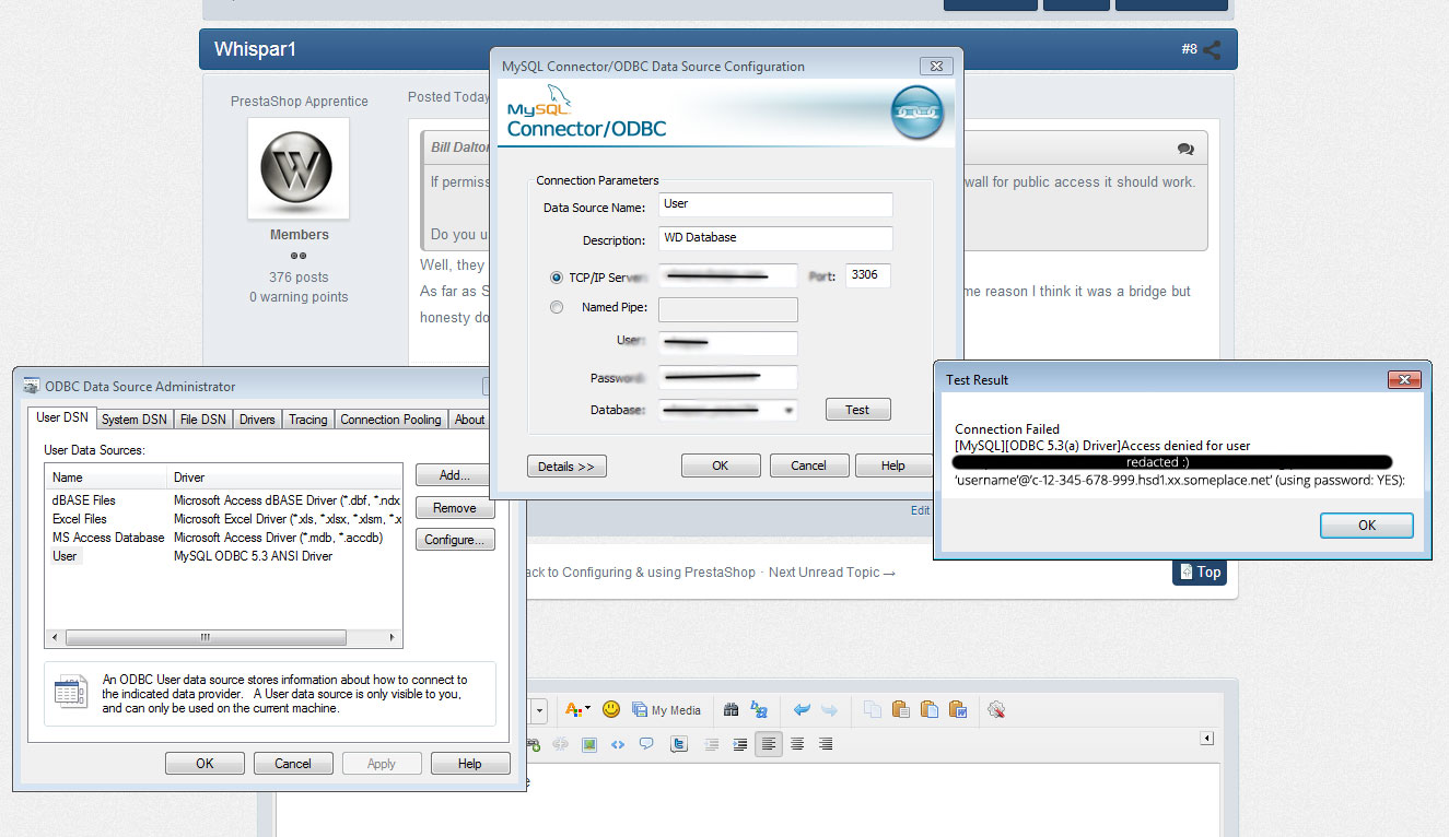 Bill Dalton Posted May 21, 2014 Share Posted May 21, 2014 (edited) Ok, that looks good, that is the response you should receive if proper privileges are not granted to the user. So you just need to give proper access. I would say your local computer is set, you just need to give correct access to the user at your host. Your port access appears to be all setup. Edited May 21, 2014 by Bill Dalton (see edit history) Link to comment Share on other sites More sharing options...