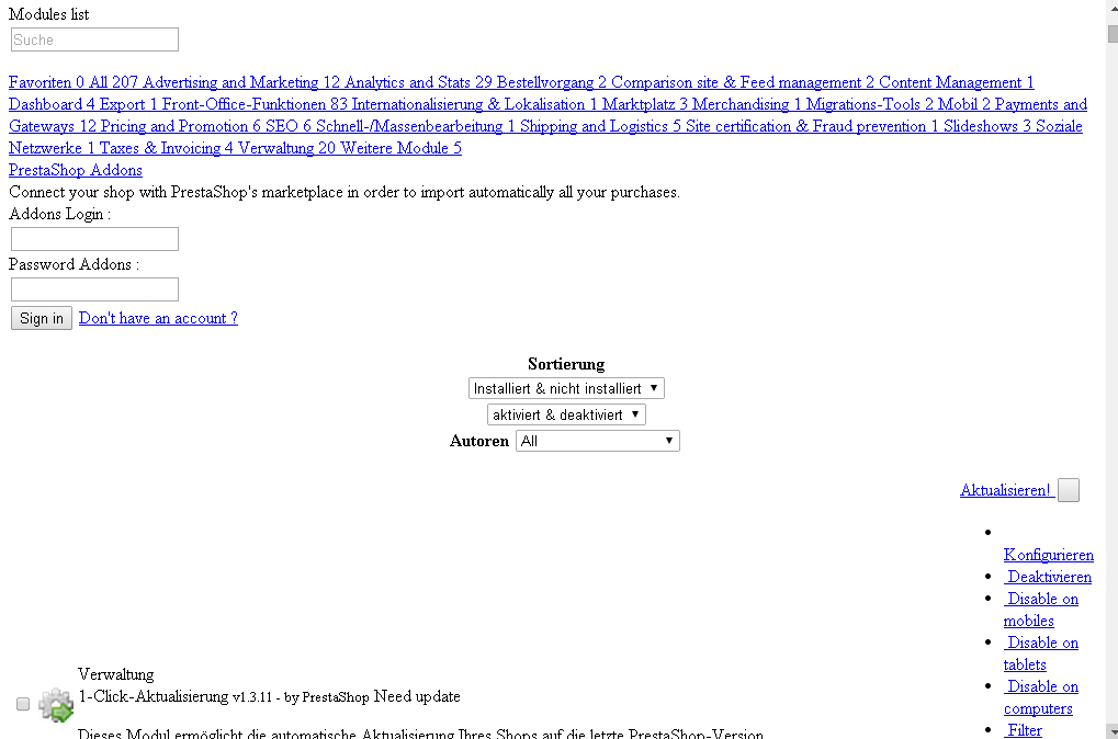 pichDE73 Posted May 22, 2014 Share Posted May 22, 2014 Hi All, I have updated to 1.6.0.6 and it seem everything working fine except in the modules section, all of module displaying not compatibilities or as texts (see screenshot). I have re-installed all of modules but still happens. Does anyone help please. Thanks in advance Link to comment Share on other sites More sharing options...