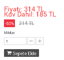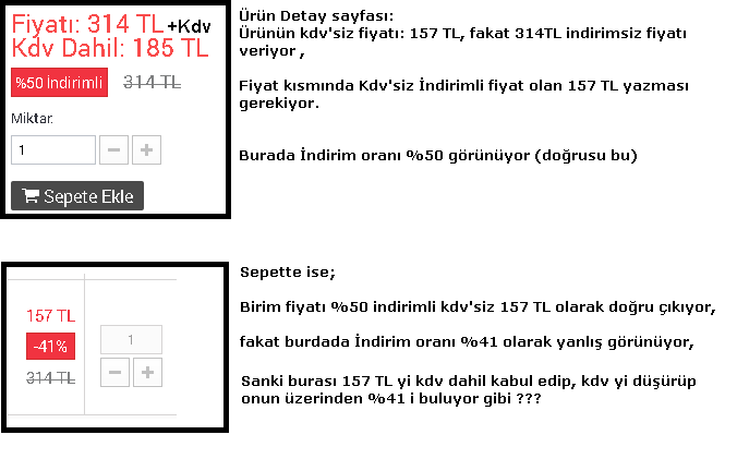 driver13 Posted May 24, 2014 Author Share Posted May 24, 2014 aynı zamanda şimdi farkettim, anasayfada ürün listelemede %50 indirim yazarken sepete atıldığında ürün %41 indirim yazıyor, doğrusu %50 indirim ama sepetteki indirim ifadesi kdv'siz fiyattan kdv düşerek %41 i buluyor. üstteki ve bu soruma yardımcı olurmusunuz? teşekkürler. Link to comment Share on other sites More sharing options...
