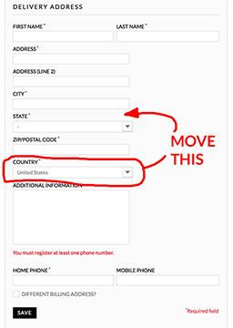 Hucklesauce Posted May 27, 2014 Share Posted May 27, 2014 We ship international. We want the Select Country Pulldown to be under the City text box with the State pulldown under the Country Pulldown. So the order should be this: City Country State Zip Currently its: City State Zip Country We have tried everything and can't figure out why the country pulldown won't move. Any help? This makes no sense. Gerardo Link to comment Share on other sites More sharing options...