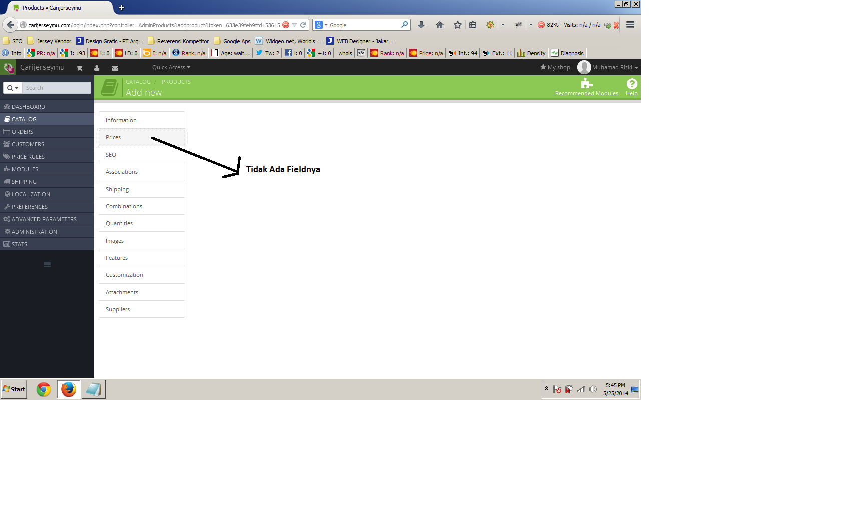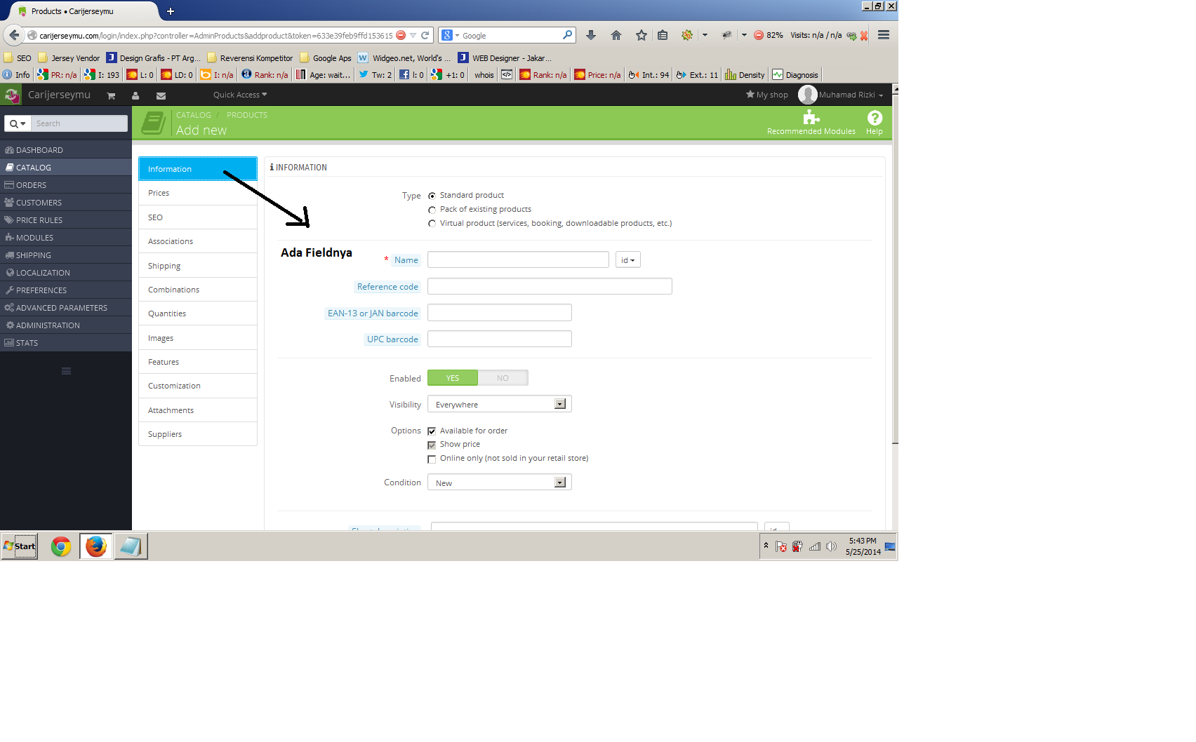 rizkimultimedia Posted May 27, 2014 Share Posted May 27, 2014 Malam Para Master Saya ingin bertanya, saya memiliki permasalahan di prestashop 1.6 , saya tidak bisa memasukan produk karna field di add katalog error dan tidak muncul. Field Yang Muncul hanya di TAB Information Untuk DI TAB PRICE SAMPE KEBAWAH Tidak Muncul itu kenapa ya gan. mungkin ada yang bisa bantu saya. Untuk gambarnya saya lampirkan dibawah ini. Link to comment Share on other sites More sharing options...