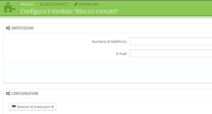 MacMax Posted May 28, 2014 Share Posted May 28, 2014 (edited) Non sono pratico di prestashop. Ho installato da un paio di giorni l'ultima versione 1.6.5 in italiano.Non riesco a trovare il sistema per cambiare il numero telefonico che appare a sinistra del piccolo menù subito sotto l'header. Azionando live edit ho visto che quella zona si chiama "blocco contatti". Ma il contatto in fondo alla pagina è corretto, è solo in questo punto che appare il numero telefonico "0123-456-789" al posto del mio.Come posso fare perché appaia il mio numero correttamente?Grazie anticipatamente a chi vorrà aiutarmi Edited June 15, 2014 by MacMax (see edit history) Link to comment Share on other sites More sharing options...