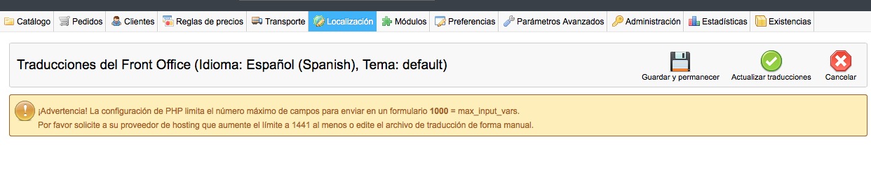 mariadelao Posted June 3, 2014 Author Share Posted June 3, 2014 mariadelao, de ser tú esperaría un poco a que algún moderador revise el post completo. Lamento decirte que al intentar ir a las traducciones me ha dado error en el límite de caracteres [¡Advertencia! La configuración de PHP limita el número máximo de campos para enviar en un formulario 1000 = max_input_vars. Por favor solicite a su proveedor de hosting que aumente el límite a 1332 al menos o edite el archivo de traducción de forma manual.] Espero sepan ayudarte lo antes posible, saludos! Vamos, lo mismo que a mí... vaya tela Link to comment Share on other sites More sharing options...