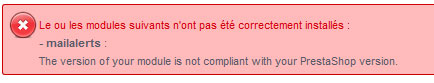 CORshop Posted June 2, 2014 Share Posted June 2, 2014 We have upgraded to Prestashop 1.5.2.0. When the existing Mail Alert v. 3.2.8 Module is uninstalled and we try to reinstall it (because it does not work), the message "Mail Alert is not compliant with this version of Prestashop" comes up. What version of Mail Alert is compliant with Prestashop 1.5.2.0, and where can it be obtained, please? Link to comment Share on other sites More sharing options...