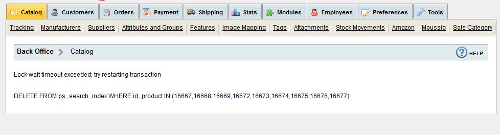 PartyTime Posted June 2, 2014 Share Posted June 2, 2014 Hey There, I am using PS 1.4.3 and just started getting an error when adding products. Lock wait timeout exceeded; try restarting transaction DELETE FROM ps_search_index WHERE id_product IN (16667,16668,16669,16672,16673,16674,16675,16676,16677) Any ideas?? I can't find the answer anywhere..... Link to comment Share on other sites More sharing options...