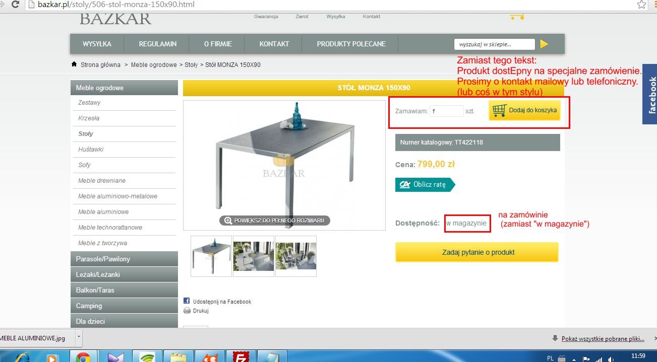 Chciałabym dodać nowa kategorię do sklepu www.bazkar.pl, w której na stronie produktów z tej kategorii (i wszystkich podkategoriach) zamiast :dodaj do koszyka" byłby inny tekst (mniej więcej tak jak w załączniku). W pozostałych kategoriach nic nie miałoby się zmienić. Domyślam się, że wymaga to edycji pliku tpl (php?). Tylko których?