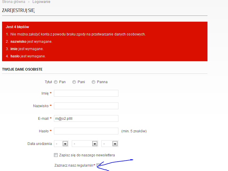 Próba dodanie checkbox-a obowiązkowego w rejestracji