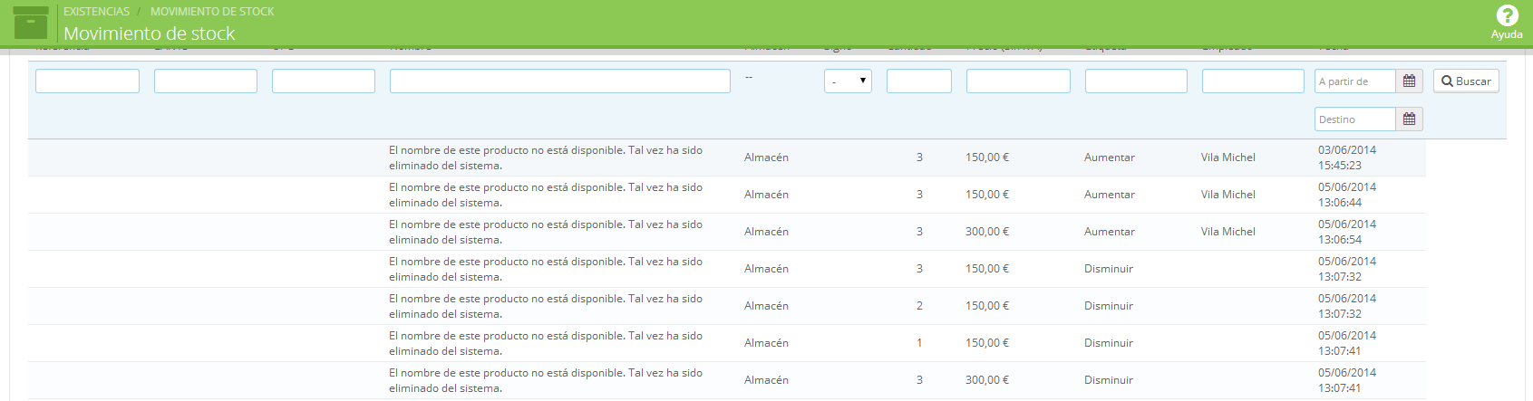 Mi duda es la siguiente: He habilitado la Gestión avanzada de stock dado que quiero guardar un historial de los movimientos que se realizan en el almacén, el problema es que al revisar ese historial ('Existencias -> Movimientos de stock' en el BackOffice) todos los datos se muestran correctamente en los aumentos de stock. Pero curiosamente los de disminución de stock no: Tal y como se puede apreciar en la imagen adjunta post-804763-0-77404200-1402007451_thumb.png no aparece el nombre del empleado que llevó a cabo esa acción y me gustaría que esos datos quedasen patentes en el historial.