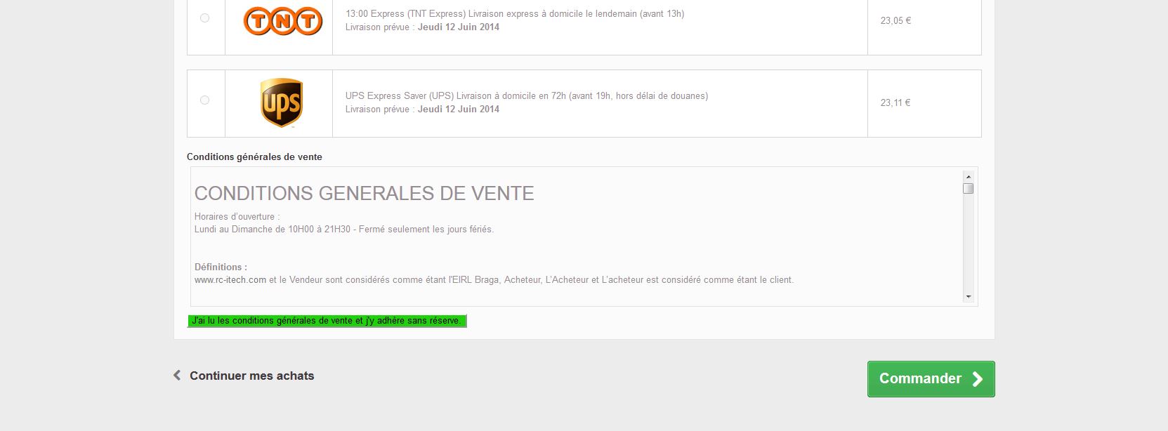 J'ai donc fait un petit bout de code permettant aux clients de lire les CGV directement sur la page des transporteurs, mais la différence c'est qu'a la place de la case à cocher, j'ai mis un bouton qui devient vert quand on clique dessus, et donc qui fait accepter les CGV. Je crois, d'après ce que j'ai lu sur cette loi, que les cases à cocher deviennent interdites sur le processus de commande et même comme options dans le panier.