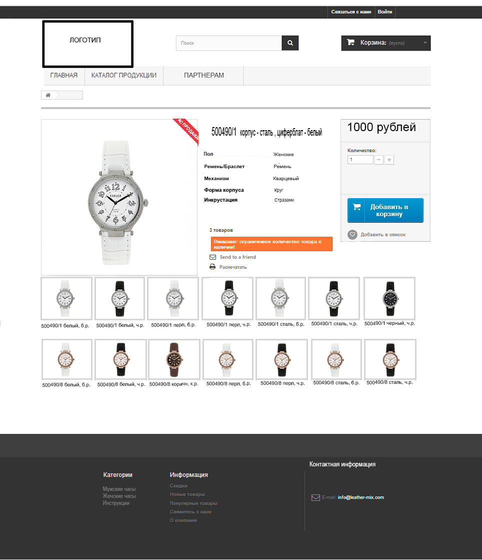 Необходимо, чтобы смена моделей происходила не во время подбора комбинаций в правом блоке (их можно вообще удалить), а по клику на миниатюры под главным изображением (в левой части). При этом нужно сохранить возможность искать продукцию по фильтрам цвет корпуса, цвет ремешка/браслета, цвет циферблата... К тому же миниатюры должны отображаться все доступные по ширине страницы, а не прятаться в слайдер (см. приложение).