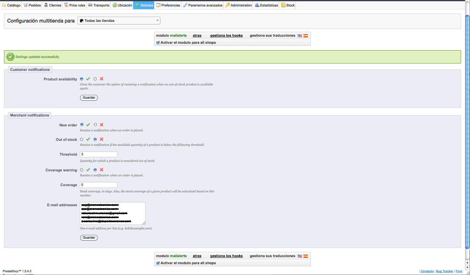 robertochm Posted June 9, 2014 Share Posted June 9, 2014 Hola buenas tardes a todos, me acabo de registrar en el Foro y tengo un problema y es que desde el día 19 de Mayo deje de recibir a mi correo los Pedidos que hacian en mi página. He mirado post de los que hablan del tema pero yo no consigo que me funcione. La version de mi Prestashop es la 1.5.4.0 ya he configurado el Modulo de Mail Alerts (la version del modulo es la 3.3) pero sigo sin recibir los pedidos que me hacen. Podrian darme alguna solución o poner una imagen de como deberia de estar configurado para que los correos que tengo puestos reciban los pedidos? Gracias. Saludos P.D: Les envio la imagen de como tengo yo configurado el Modulo. Link to comment Share on other sites More sharing options...