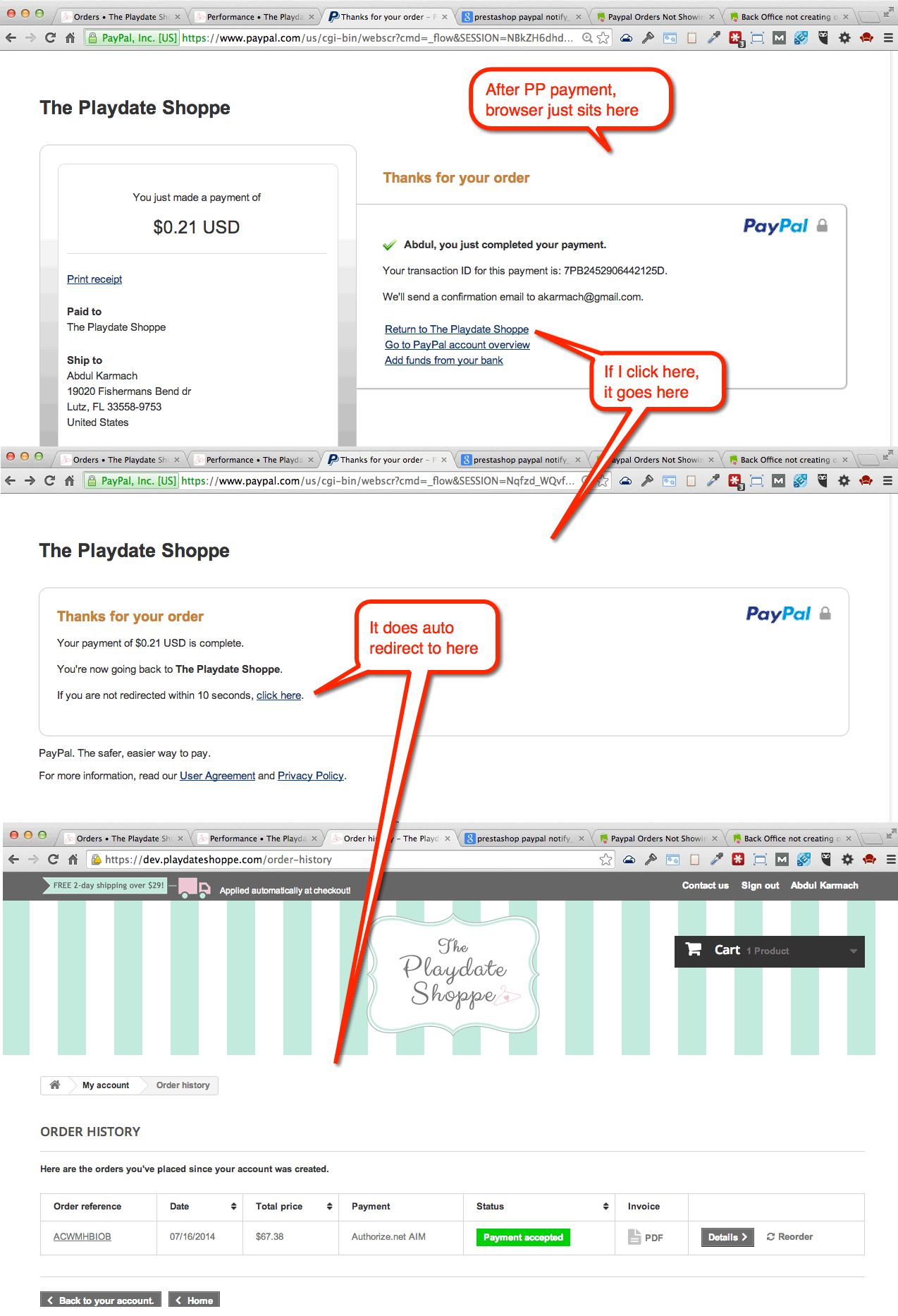 abdulk Posted August 14, 2014 Share Posted August 14, 2014 bellini13, your code worked perfectly and the "notify_url" is now https://dev.playdateshoppe.com/module/paypalusa/validation?pps=1 but sill no order :/ Latest Paypal HTML: <form action="https://www.paypal.com/cgi-bin/webscr" method="post"> <p class="payment_module"> <input type="hidden" name="cmd" value="_cart" /> <input type="hidden" name="upload" value="1" /> <input type="hidden" name="charset" value="utf8" /> <input type="hidden" name="business" value="[email protected]" /> <input type="hidden" name="currency_code" value="USD" /> <input type="hidden" name="custom" value="212;1" /> <input type="hidden" name="amount" value="0.2" /> <input type="hidden" name="first_name" value="Bob" /> <input type="hidden" name="last_name" value="Jones" /> <input type="hidden" name="address1" value="112 Kennedy lane" /> <input type="hidden" name="city" value="San Diego" /> <input type="hidden" name="state" value="CA" /> <input type="hidden" name="zip" value="90210" /> <input type="hidden" name="email" value="[email protected]" /> <input type="hidden" name="night_phone_b" value="8105310255" /> <input type="hidden" name="address_override" value="1" /> <input type="hidden" name="item_name_1" value="Your order" /> <input type="hidden" name="amount_1" value="0.2" /> <input type="hidden" name="tax_cart" value="0.01" /> <input type="hidden" name="notify_url" value="https://dev.playdateshoppe.com/module/paypalusa/validation?pps=1" /> <input type="hidden" name="return" value="http://dev.playdateshoppe.com/order-confirmation?id_cart=212&key=0c8985e832a4eef36030f1bcd2bec22b&id_module=92" /> <input type="hidden" name="cancel_return" value="http://dev.playdateshoppe.com/order" /> <input type="hidden" name="no_shipping" value="1" /> <input type="hidden" name="bn" value="PrestashopUS_Cart" /> <input id="paypal-standard-btn" type="image" name="submit" src="https://www.paypalobjects.com/en_US/i/bnr/horizontal_solution_PPeCheck.gif" alt="" style="vertical-align: middle; margin-right: 10px;" /> Pay with PayPal </p> I made a screenshot of the exact flow that's happening (see attachment). anncrow, do you have any settings enabled in PP to send IPN or Returns? I didn't have any of these enabled before. We're closer! 1 Link to comment Share on other sites More sharing options...
