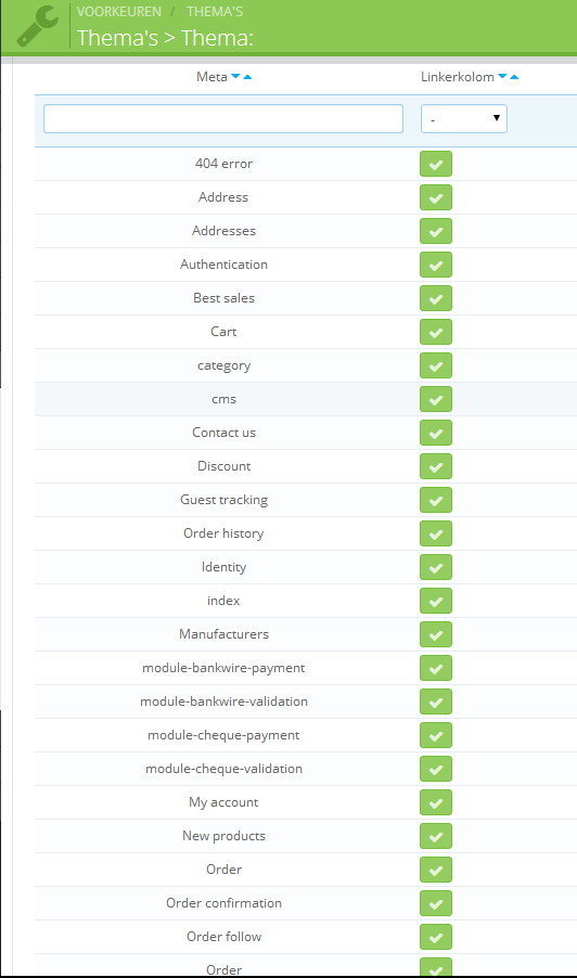 niels194 Posted June 15, 2014 Share Posted June 15, 2014 (edited) Hello everybody I am new to prestashop and just installed prestashop 1.6. Now I have got a problem with te left column. I have enabled the left column on every page of the theme (see picture) I have followed this post: http://mypresta.eu/en/art/prestashop-16/an-error-occured-while-updating-this-meta.html, but its not helping. The left column does appear on the category page, but not on the CMS pages. e.g. I want the left column also on the 'About us' page wich is a CMS page, created in the backoffice. In the header.tpl file I see that the $HOOK_LEFT_COLUMN is checked if it is set and not empty before the {$HOOK_LEFT_COLUMN} is called. Do I have to set this hook? How do I get the left column on my CMS pages? Edited June 15, 2014 by niels194 (see edit history) Link to comment Share on other sites More sharing options...