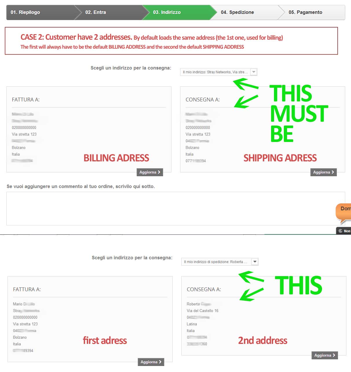 straynetworks Posted June 18, 2014 Share Posted June 18, 2014 (edited) Hello everyone,i needed to customize the order process in the address choose in this way:CUSTOMERS WILL HAVE MAX 2 ADDRESSES:the first address is created in the account registration step along with billing infos, so tis first address will be set as "my billing address"the second one will carry only the shipping infos, no vat, company, dni, and will be titled "my shipping address".In the address.tpl the field "alias" is hidden so titles can't be edited, nor is possibile add another address ("my shipping address" already exists)In the addresses.tpl the button "add address" is unvisible if $addresses count > 1 and deletion is unvisible if $addresses count <2.Now the order-address.tpl page look rather fine, but even with 2 addresses the default selected shipping address is the 1st address (my billing address) i need the 2nd one (my shipping address) to be loaded by defaultThink the trick is in the js in the theme (/themeroot/js/order-address.js) that assign to both cart addresses the same id (or alias). The real change of address happens only on select changeCan't go over on , every try fails. Even if the right address is displayed, the form registers anyway the same addr. for billing and shipping. Anyone have some hints about? Thanks in advance! Edited June 18, 2014 by straynetworks (see edit history) Link to comment Share on other sites More sharing options...