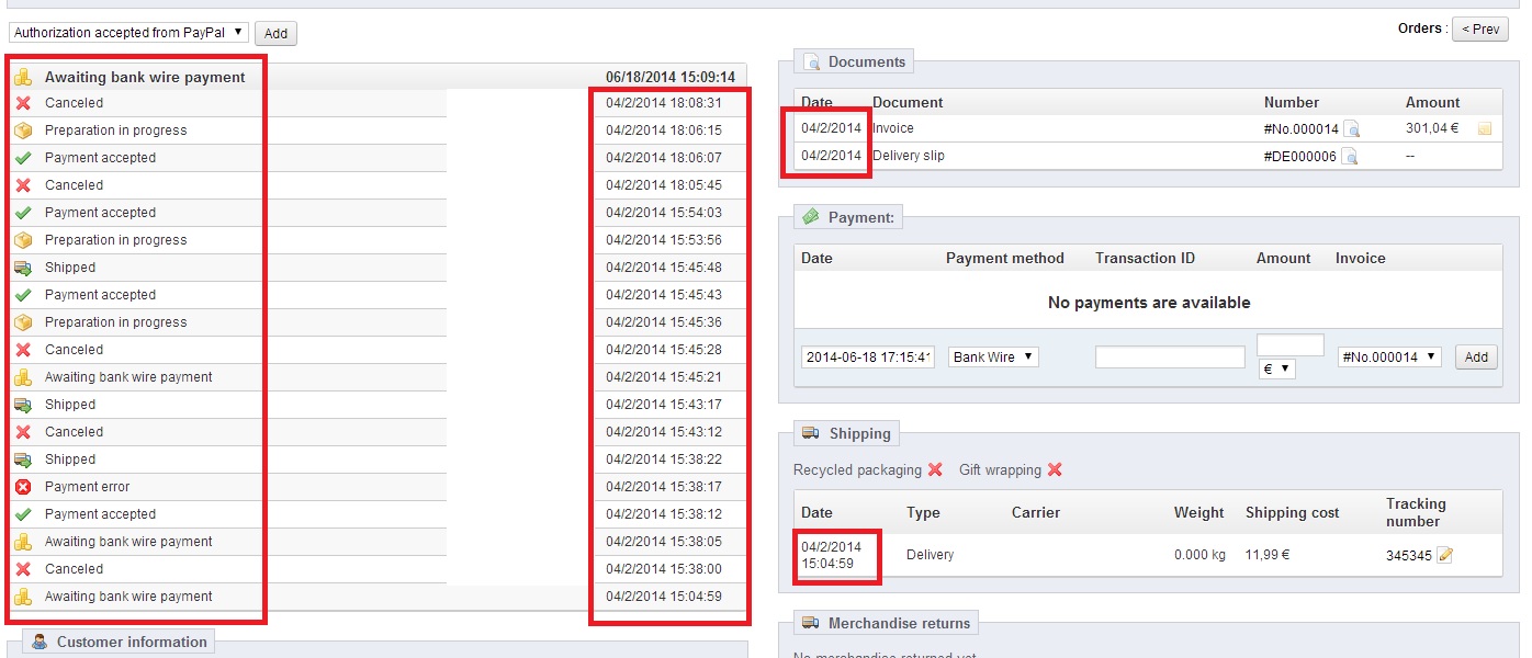 YanK1973 Posted June 18, 2014 Share Posted June 18, 2014 I'm on Prestashop 1.5.4.1 In every order i get MANY fake order statuses, all sort of statuses, completely random... In the attached screenshot you see that and i also noticed that all fake statuses have the same wrong date that appears in Invoice too plus a "fake" tracking number that i have no idea where it came from. I used to have an issue with "ghost" products as well that were added in real orders but after reading the forum and help from PascaVG i deleted test and fake orders in DB that were responsible for adding "ghost" products. So i guess i must look in db for something else i need to delete but what?? Link to comment Share on other sites More sharing options...