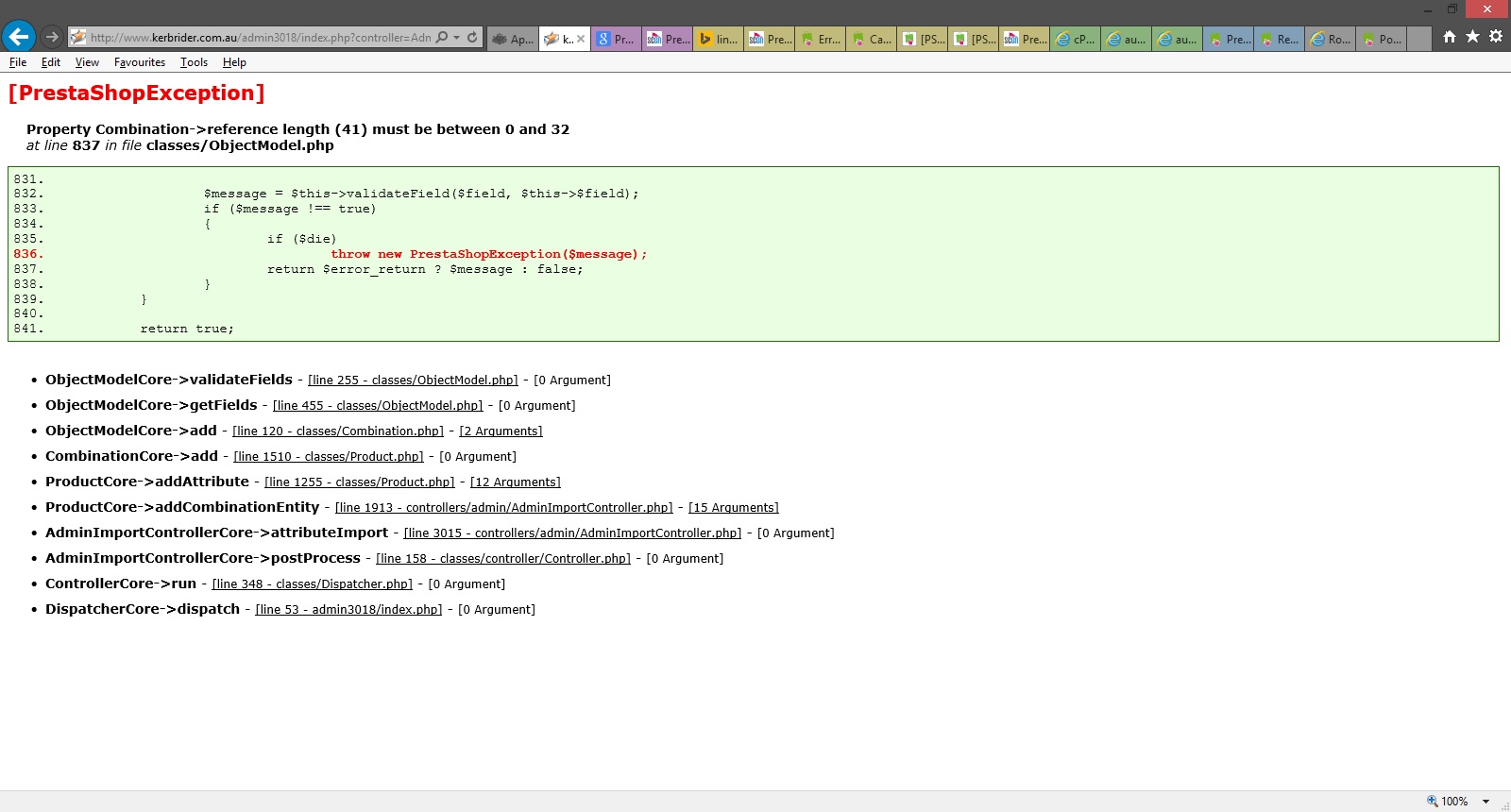 s.cam Posted June 19, 2014 Share Posted June 19, 2014 Hi there. I recently had this error display whilst trying to upload a csv file of combinations. I'm not sure what it means or how to fix this. Bellow is the error I receive and I have also attached a screen dump of the issue. Any help on this matter would be greatly appreciated. I want my store to go live and this is the only thing standing in my way. [PrestaShopException] Property Combination->reference length (41) must be between 0 and 32at line 837 in file classes/ObjectModel.php 831.832. $message = $this->validateField($field, $this->$field);833. if ($message !== true)834. {835. if ($die)836. throw new PrestaShopException($message);837. return $error_return ? $message : false;838. }839. }840.841. return true; •ObjectModelCore->validateFields - [line 255 - classes/ObjectModel.php] - [0 Argument]•ObjectModelCore->getFields - [line 455 - classes/ObjectModel.php] - [0 Argument]•ObjectModelCore->add - [line 120 - classes/Combination.php] - [2 Arguments]•CombinationCore->add - [line 1510 - classes/Product.php] - [0 Argument]•ProductCore->addAttribute - [line 1255 - classes/Product.php] - [12 Arguments]•ProductCore->addCombinationEntity - [line 1913 - controllers/admin/AdminImportController.php] - [15 Arguments]•AdminImportControllerCore->attributeImport - [line 3015 - controllers/admin/AdminImportController.php] - [0 Argument]•AdminImportControllerCore->postProcess - [line 158 - classes/controller/Controller.php] - [0 Argument]•ControllerCore->run - [line 348 - classes/Dispatcher.php] - [0 Argument]•DispatcherCore->dispatch - [line 53 - admin3018/index.php] - [0 Argument] Link to comment Share on other sites More sharing options...