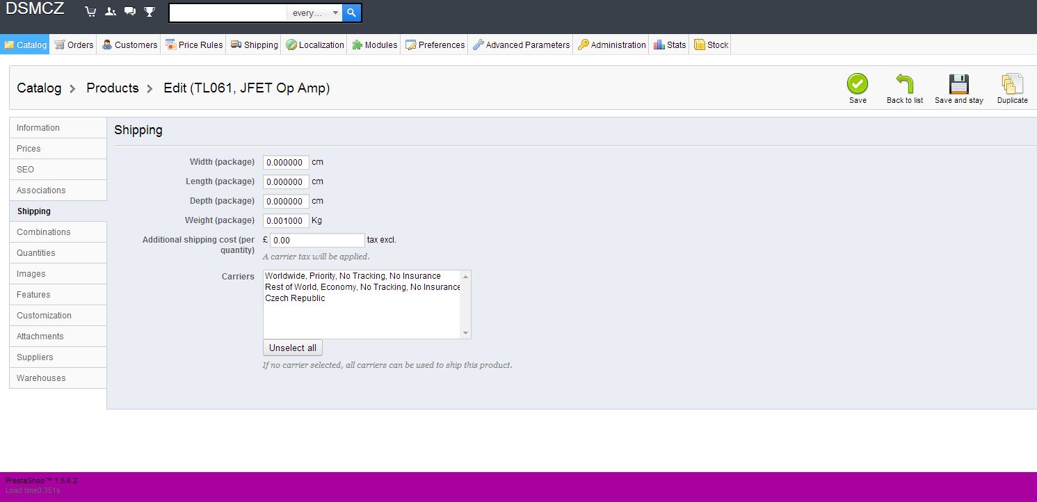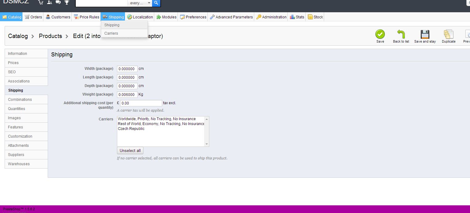 dsmcz Posted June 20, 2014 Share Posted June 20, 2014 Hi... I have products in my shop, which have identical data on the shipping page (of that product) - maybe the weight is slightly different. They all have the same carriers. One product will show all the carriers at checkout, the other shows no carriers available Working product:- http://dsmcz.com/presta/en/analogue/1813-tl082-dual-jfet-op-amp.html Non Working Product:- http://dsmcz.com/presta/en/adaptors/1769-2-into-1-35mm-jack-adaptor.html Prestashop is 1.5.6.2 Screenshots of the admin pages of each product are attached... Duplicating a non working product, and deleting the old one doesn't help. Damian Link to comment Share on other sites More sharing options...