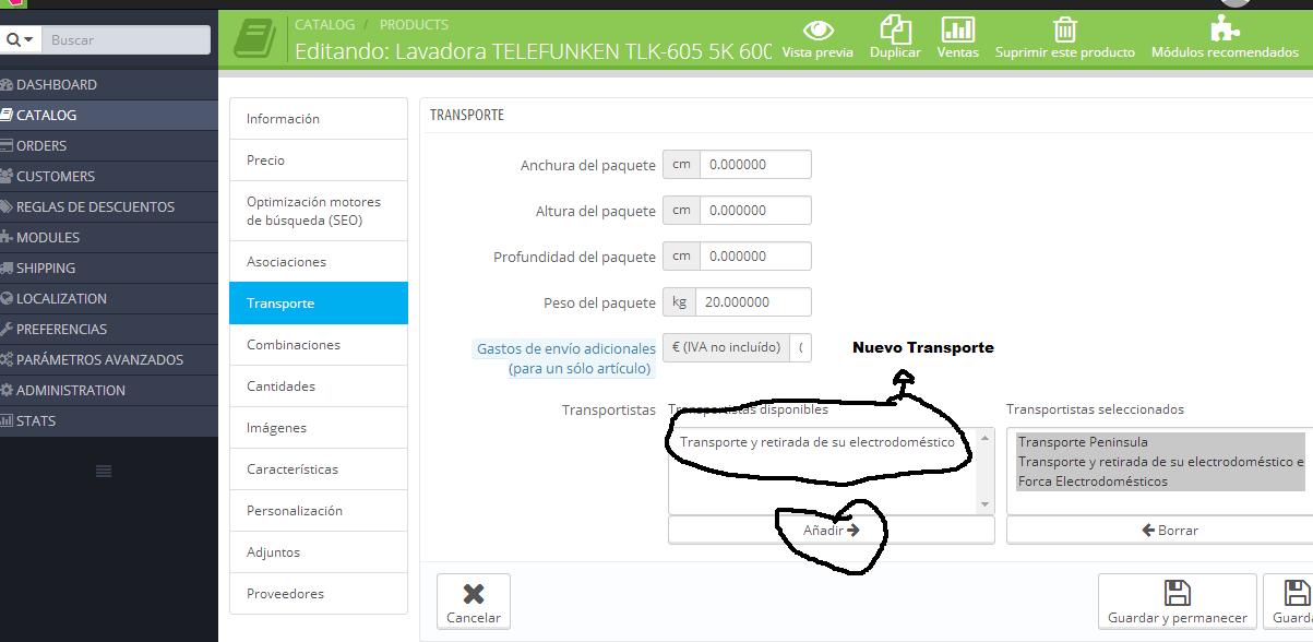 Varg Posted June 25, 2014 Share Posted June 25, 2014 (edited) Mueve todo los transportes que creaste al apartado que dice "Transportistas disponibles". Al hacer esto, cada persona que realice una compra tendrá todas las opciones de transporte que tu creaste, solo tendrá que elegir una. Por lo tanto los transportes que estén en "Transportistas disponibles" serán visualizado en todos los productos de forma genérica (Y que por defecto aparecen todos los transportes en "Transportistas disponibles"). El apartado "Transportistas seleccionados", creo que funciona para especificar un tipo de transporte a un producto específico. Si lo que necesitas es asignar un transporte determinado a una cantidad de productos específica, creo que no lo podrás hacer de forma grupal o múltiple, mas bien uno por uno. Saludos Edited June 25, 2014 by Varg (see edit history) Link to comment Share on other sites More sharing options...