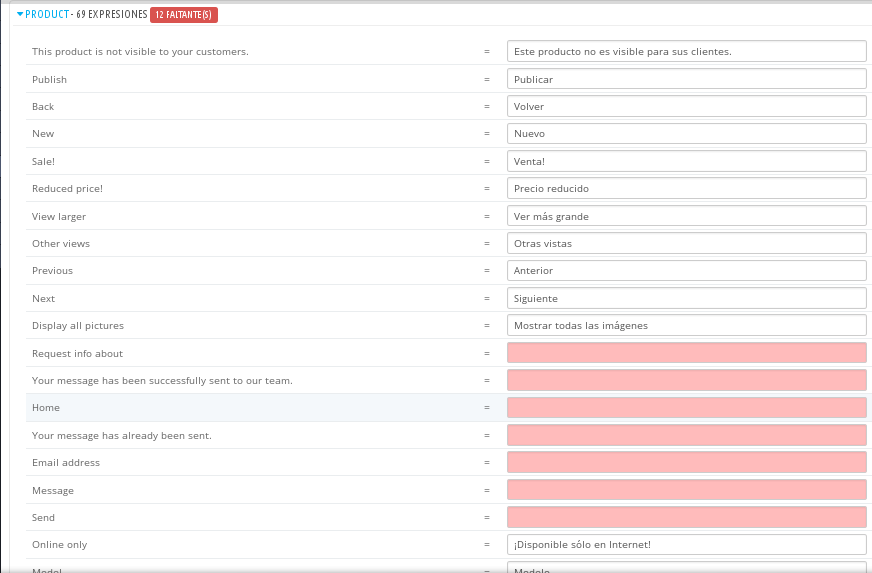Como comenté más arriba, dejé los mensajes a cliente en el .tpl en su formato original en inglés, con el fin de traducirlos desde el menú de traducciones, pues bien,