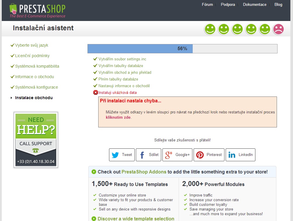 erico01234 Posted June 25, 2014 Share Posted June 25, 2014 Pri inštalácií presty 1.6.0.7 mi inštalačný proces zakaždým zlyhá na Instaluji ukázková data a nechce sa to pohnuť ďalej. Hosting je v pohode nakoľko nanom bežia dva iné prestashopy (1.5.6 a 1.5.6.2) a pri ich inštalácií problem nebol. hosting je na nginx s php5 a mysql. Za každú radu budem vdačný Link to comment Share on other sites More sharing options...