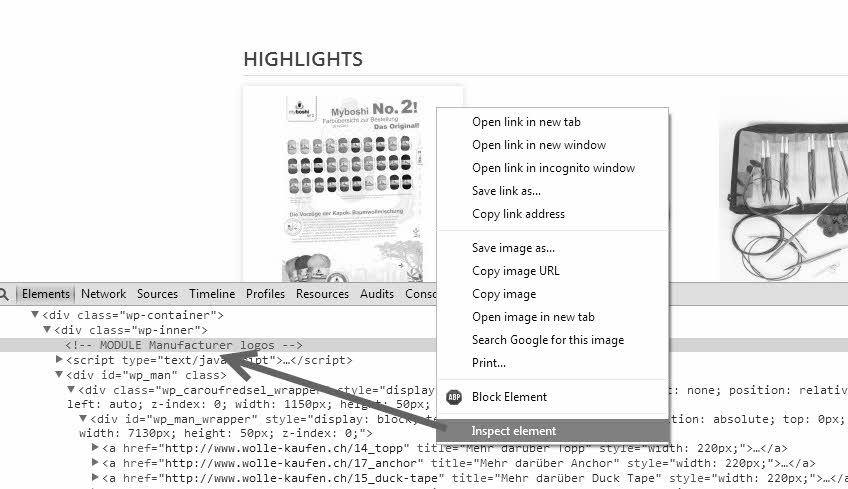 Pronux Posted June 28, 2014 Share Posted June 28, 2014 Ich denke, ein spezifisches Tool dafür gibt es nicht. Diese Frage stellt sich mir jedoch auch oft. Um herauszufinden, was/welches Modul im Shop für die Ausgabe von Content (Bilder/Text) an einer Stelle verantwortlich ist, nutze ich die in Google Chrome integrierten Developer Tools d.h. mit der rechten Maustaste auf das entsprechende Element klicken und dann den Quellcode nach einem Hinweis suchen, z.B. Hoffe diese Info hilft dir weiter, vielleicht hat jemand anders ja noch einen besseren Tipp. Link to comment Share on other sites More sharing options...